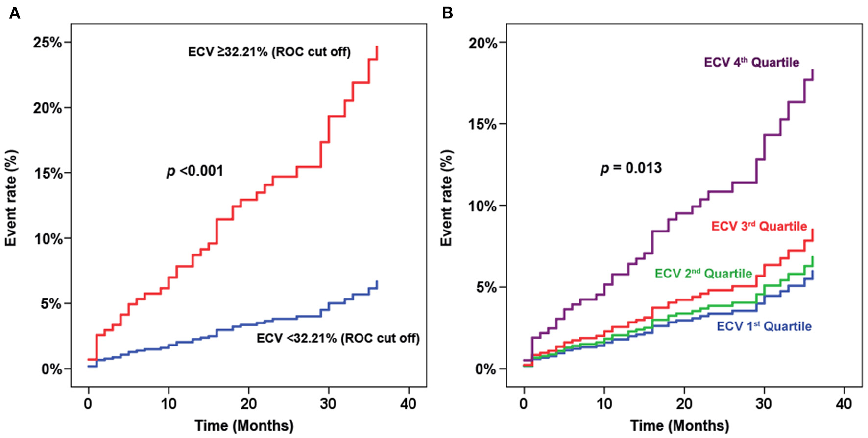 Sensitivity analysis of extracellular volume fraction (ECV) for predicting clinical outcomes. (A) Hazard graph of patients with ECV above and below the cut-off value derived from receiver operating characteristic (ROC) curve analysis. (B) Hazard graph of each quartile of ECV.