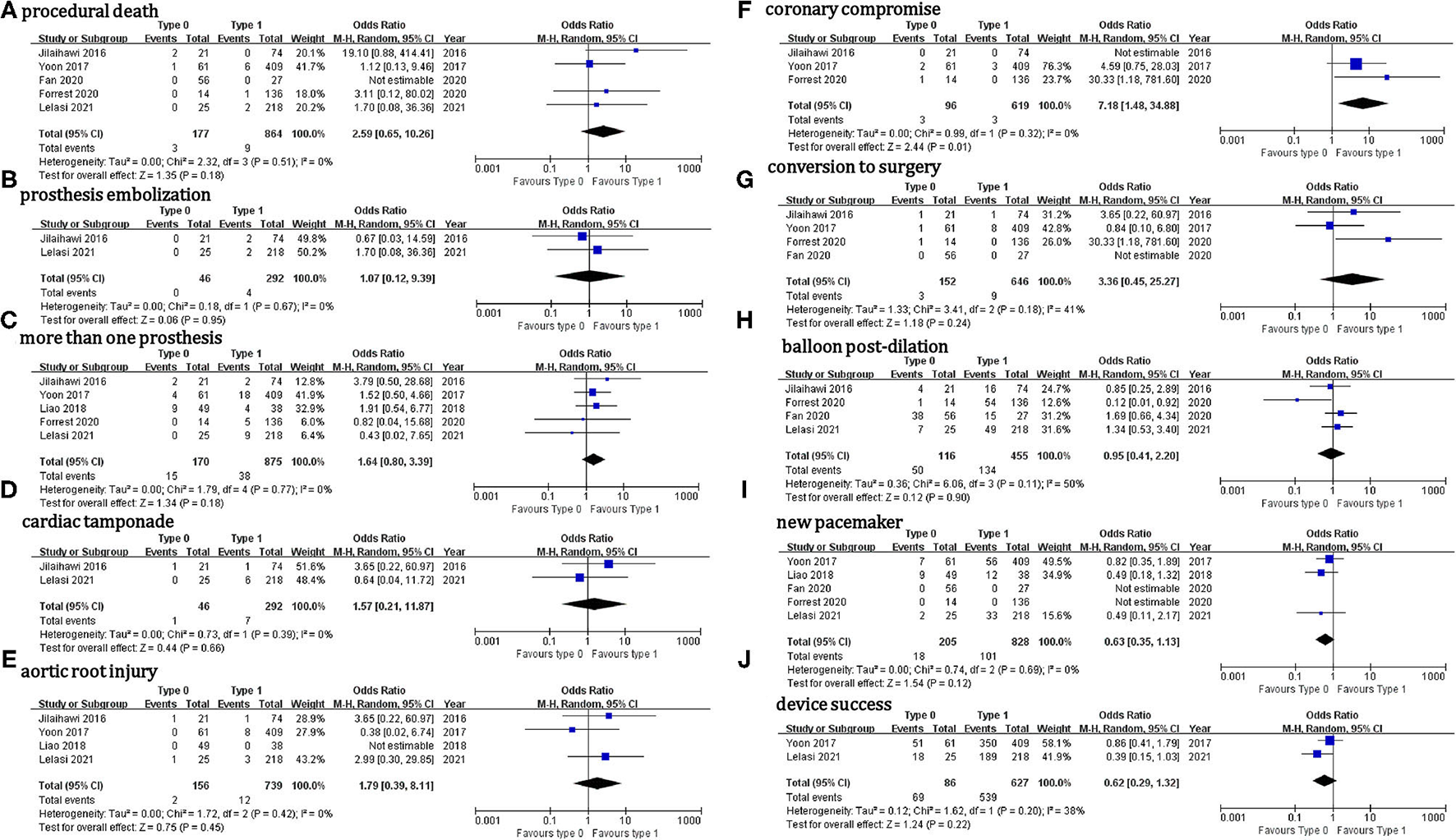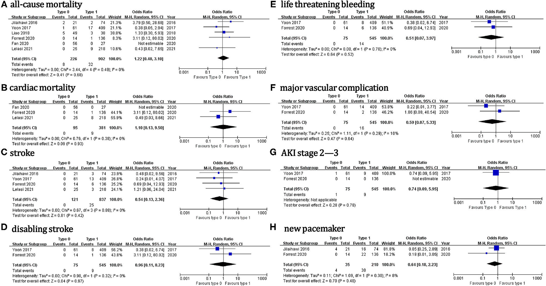 | Jilaihawi et al. (13) | Yoon et al. (8) | Liao et al. (19) | Fan et al. (20) | Forrest et al. (23) | Ielasi et al. (22) | MD or OR | 95% CI | P-value | |||||