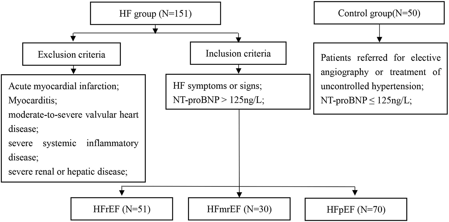 This study enrolled consecutive patients from October 2018 to January 2020. The inclusion criteria were: (1) HF symptoms or signs; (2) NT-proBNP >125 ng/ml; and (3) patients were divided into left ventricular ejection fraction (LVEF) < 40% (HFrEF); LVEF ≥ 40% and < 50% (HFmrEF) and LVEF ≥ 50% (HFpEF) groups. The control group enrolled patients referred for elective angiography or treatment of uncontrolled hypertension with NT-proBNP ≤ 125 ng/l. Exclusion criteria included acute myocardial infarction, myocarditis, moderate-to-severe valvular heart disease, severe systemic inflammatory disease, or severe renal or hepatic disease. The study was approved by the local ethics committee of the Second Hospital of Tianjin Medical University and conformed to the Declaration of Helsinki.