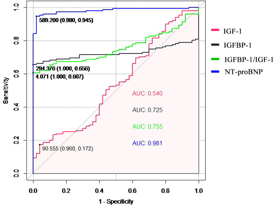 The receiver operating characteristic (ROC) curve of the diagnostic ability for heart failure of IGF-1, IGFBP-1, IGFBP-1/IGF-1 ratio, and NT-proBNP. IGF-1, insulin-like growth factor 1; IGFBP-1, IGF binding protein 1; NT-proBNP, N-terminal pro-B natriuretic peptide.