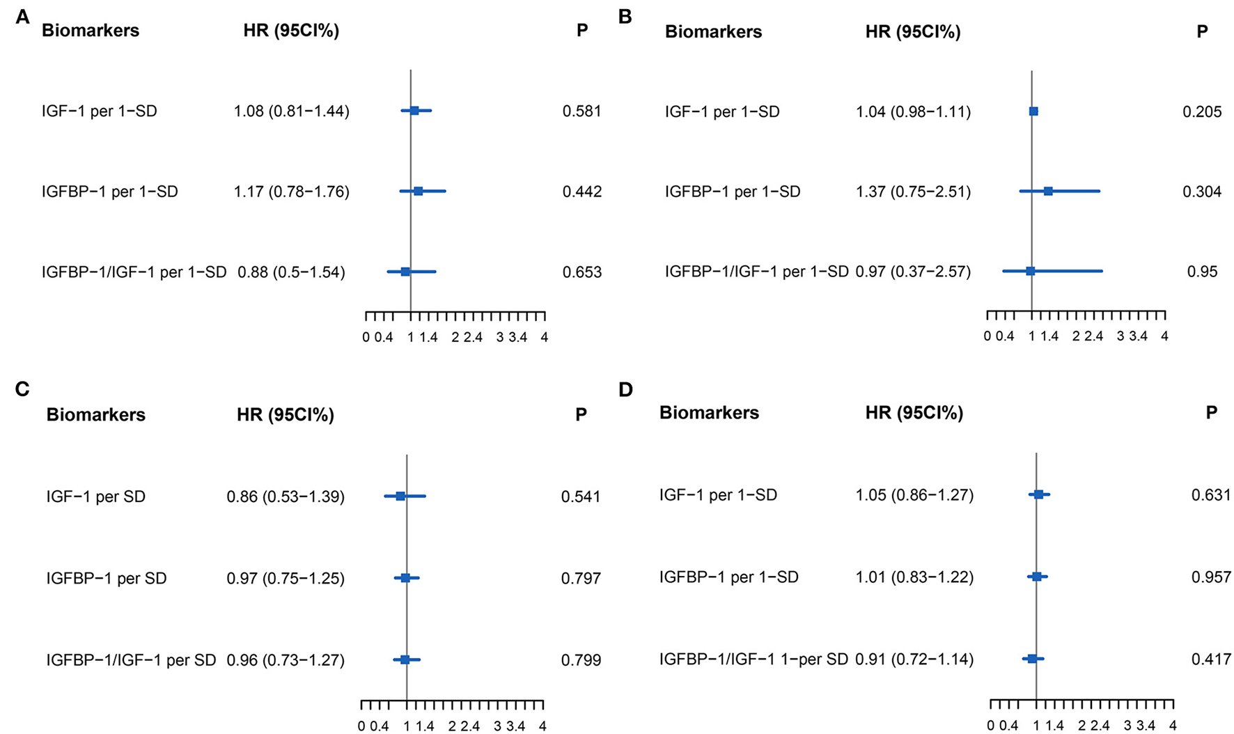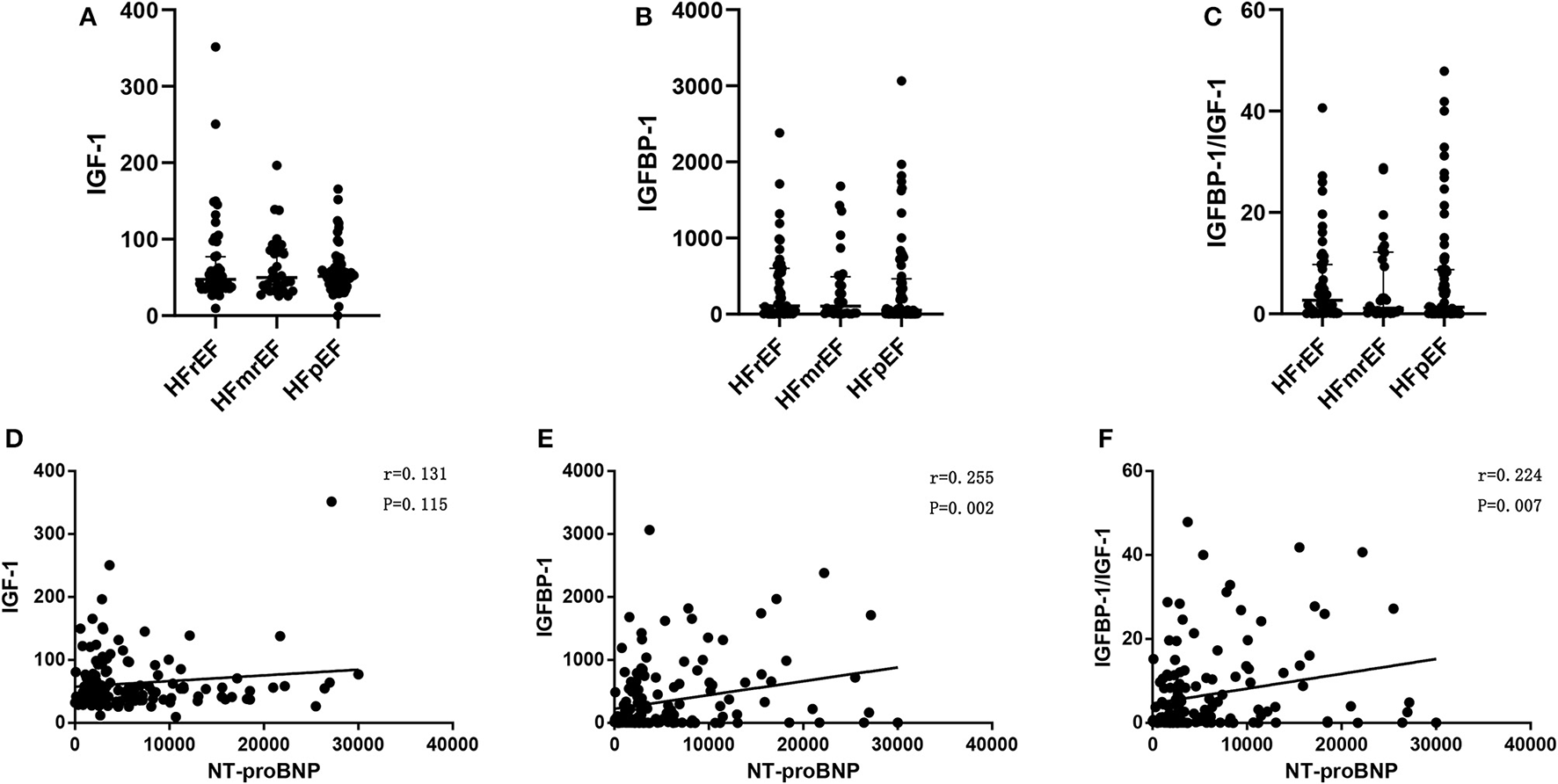 Concentrations of IGF-1, IGFBP-1, and IGFBP-1/IGF-1 ratio were compared in HFrEF, HFmrEF, HFpEF, and controls. The correlation was performed between levels of IGF-1, IGFBP-1, IGFBP-1/ IGF-1 ratio, and NT-proBNP using Pearson's r. The diagnostic value of IGF-1, IGFBP-1, and IGFBP-1/ IGF-1 ratio to identify HF were investigated and compared via the areas under the curve (AUCs) of receiver operating characteristics (ROC) curves. The Cox proportional hazard model was also performed to investigate the prognostic value of IGF-1 concentration, IGFBP-1 concentration, and IGFBP-1/IGF-1 ratio. Log-rank tests for the Kaplan–Meier survival curves were performed according to different HF subtypes. All data were analyzed using SPSS statistical software (SPSS 25.0) R programming version 4.1.1. A p-value < 0.05 was considered statistically significant.
