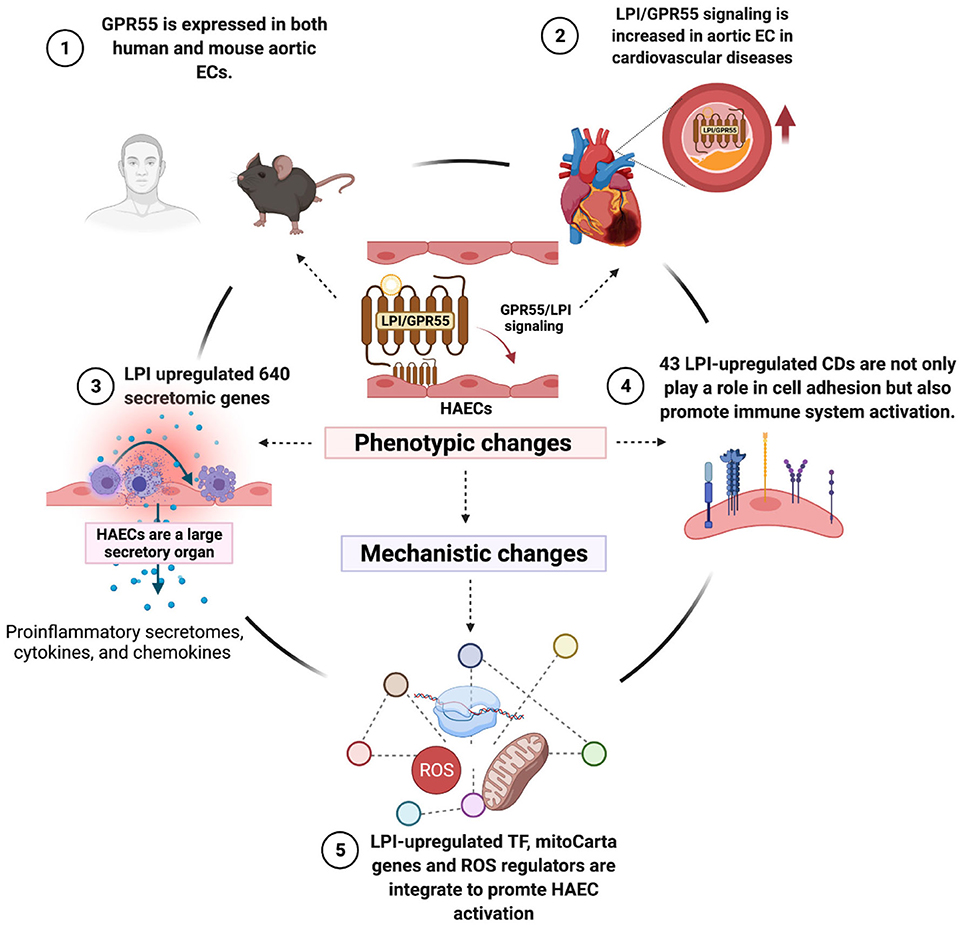 Figure 11. Working model. LPI receptor GPR55 is expressed in both human and mouse aortic endothelial cells. LPIs/GPR55 signaling is upregulated in aortic endothelial cells in hyperlipidemia. We first proposed human aortic endothelial cells as a large secretory organ, which can mediate up to 640 secretomic genes upon LPI stimulation. A large number of secretory proteins contribute a significant role in mediating EC activation and inflammation. LPI-stimulated specific CD markers not only participate in cell adhesion but also play an essential role in immune cell activation, proliferation, and differentiation. All these phenotypic changes may be caused by the mechanisms of synergy among LPI-increased TFs, mitoCarta genes, and ROS regulators. *This figure was created with Biorender.com.