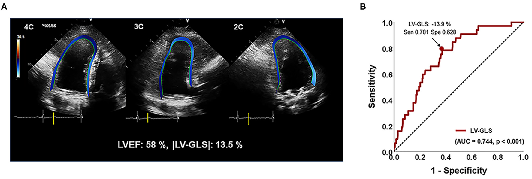 (A) Representative images for assessing LV-GLS. (B) Area under the receiver-operating characteristics curve (area under the curve) of |LV-GLS|. |LV-GLS|, the absolute value of left ventricular longitudinal strain. The Arrow indicated that the position of the value of sensitivity and specificity of 78% and 63% when |LV-GLS| has largest AUC.