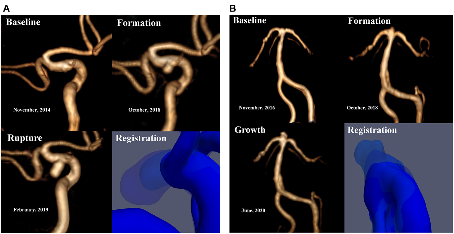 Here, we report two patients. (1) The first patient was a 56-year-old female with a history of hypertension and coronary heart disease who presented with a 10-day history of limb weakness (November 18, 2014). Cranial magnetic resonance imaging (MRI) and magnetic resonance angiography (MRA) assessments did not reveal obvious abnormalities (Figure 1A, Baseline), and the patient's symptoms resolved spontaneously without any interventions. MRA reexamination of the patient 4 years later (October 9, 2018) showed a newly formed saccular aneurysm with a diameter of 3.2 mm in the left posterior communicating artery (Figure 1A, Formation). Nevertheless, due to the small size of the aneurysm, the patient opted for follow-up observation. She was diagnosed with acute SAH by cranial computed tomography (CT) performed in response to a sudden headache 4 months later (February 14, 2019). CT angiography (CTA) showed that the aneurysm had significantly increased in size, reaching a diameter of 6.9 mm (Figure 1A, Rupture). Microsurgical clipping of the aneurysm was immediately performed, and the patient recovered well in the ward postoperatively. (2) The second patient shared some similarities with the first in terms of the developmental process of the aneurysm. Patient 2 was a 47-year-old female who underwent MRA assessment due to dizziness on November 13, 2016; the assessment did not detect any obvious abnormalities. A newly formed basilar tip aneurysm and aneurysmal enlargement were observed in the follow-up MRA examinations performed on October 9, 2018 (Figure 1B, Formation), and June 7, 2020 (Figure 1B, Growth; from 2.1 to 3.8 mm in diameter), respectively. The patient eventually received successful endovascular treatment after aneurysmal enlargement occurred.