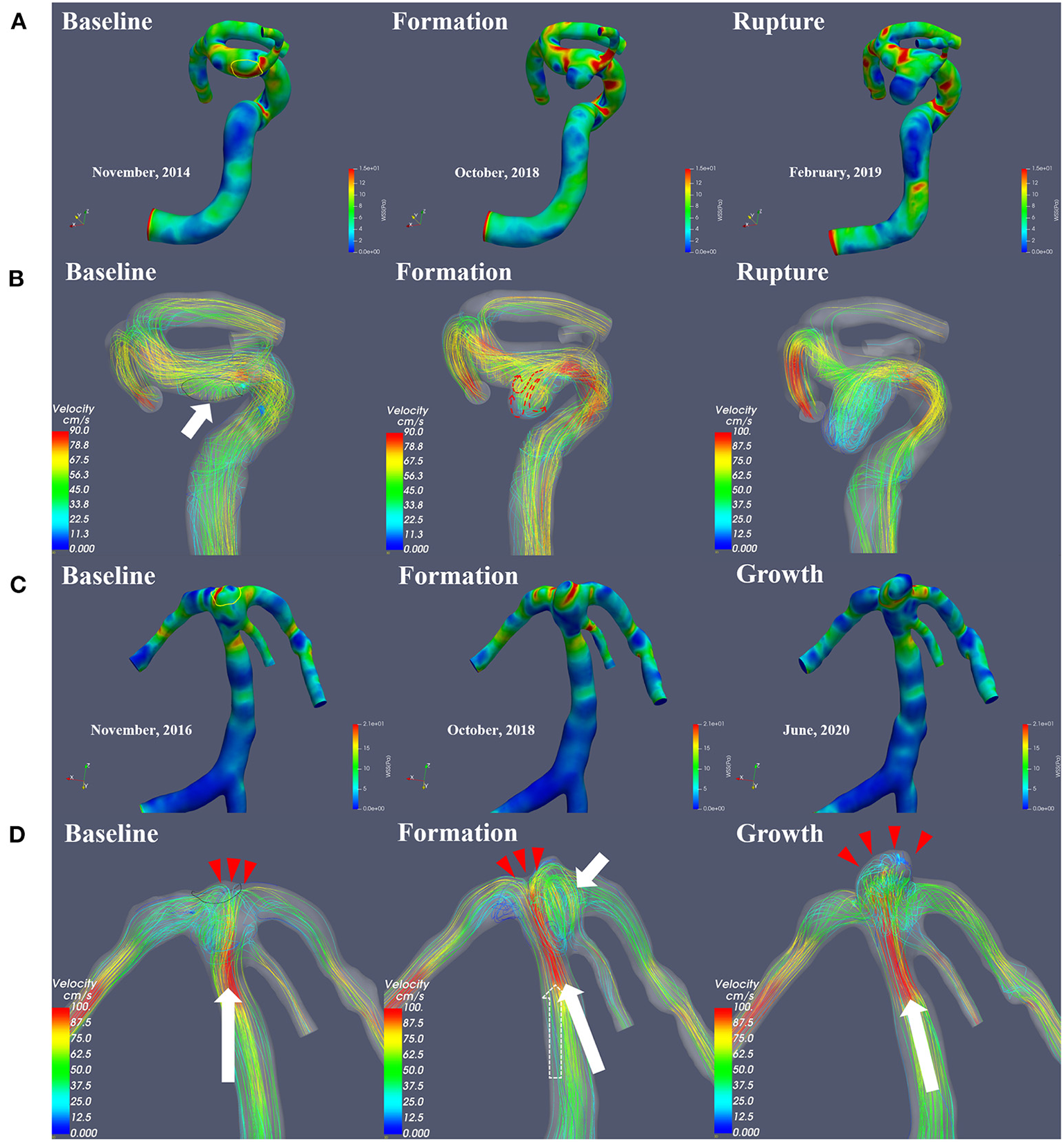 This figure illustrates the change in hemodynamic parameters during the formation, progression and rupture of IAs. The WSS distribution (A,C) and flow velocity profile (B,D) were shown, respectively. The area within the yellow line is the region of aneurysmal formation marked by the registration technique. Prior to aneurysm formation, the regions feature flows with vortex structures (B, short white arrow). In the impact region (D, Baseline, red arrows) of the concentrated high-velocity inflow jet (D, Baseline, long white arrow indicates blood flow direction), a newly formed basilar tip aneurysm was visible on follow-up angiography (D). Affected by vortex flow after the formation of the aneurysm (D, Formation, white short arrow), the main direction of flow shifted (D, Formation, from the original dotted arrow to the long white arrow), causing saccular dilatation in the new impact region (D, Formation, red arrows), and the size of the aneurysm increased (D, Growth). A complex multi-vortex flow is associated with future aneurysm growth, and rupture is related to extreme instability and complexity of blood flow patterns.