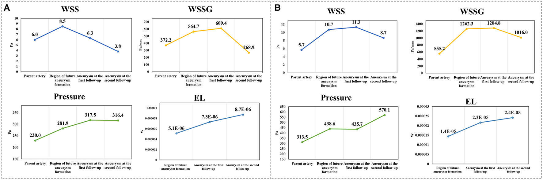 (A,B) Display the trends in the main hemodynamic parameters of patient 1 and patient 2, respectively, during continuous follow-up angiography. WSS, wall shear stress; WSSG, wall shear stress gradient; EL, energy loss.