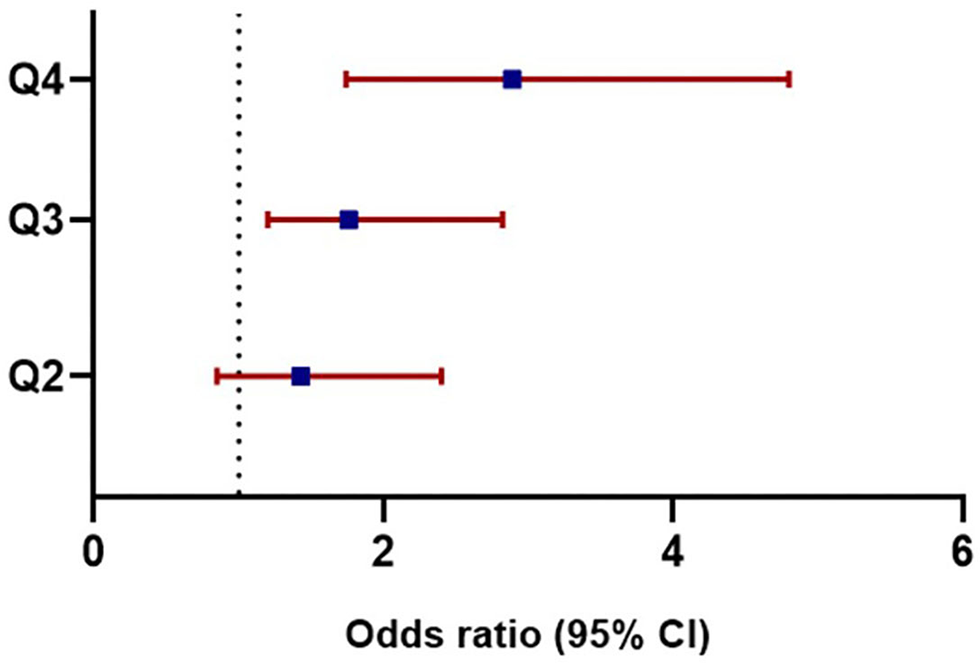 Results: The patients were divided into quartiles based on the uric acid variability. Patients in the highest quartile were older and presented lower renal function and a higher mortality from CVD. There was a linear association between a high uric acid variability and the development of CVD. Compared to the lowest quartile, patients in the higher quartiles had a higher risk of CVD [quartile 3: adjusted odds ratio (aOR) = 1.76; 95% confidence interval (CI), 1.20–2.82; P = 0.019; quartile 4 aOR = 2.89; 95% CI, 1.74–4.80; P < 0.001].