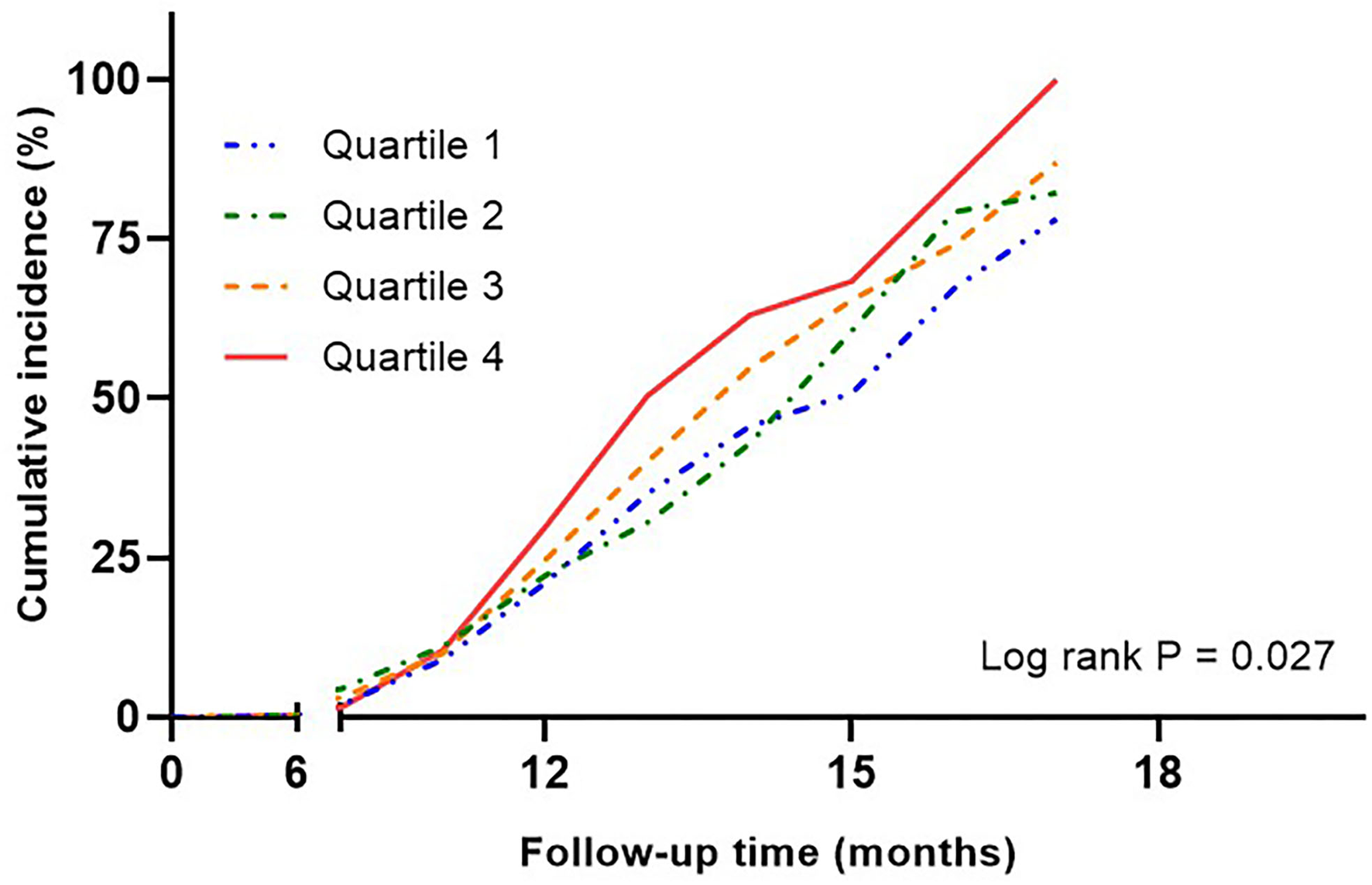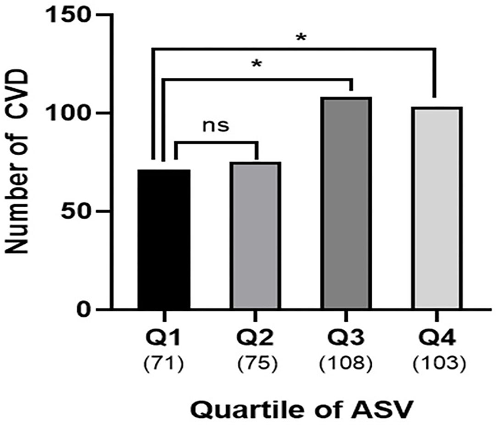 SUA was measured at least three times, with a minimum interval of 6 months prior to the index year of CVD event. Average successive variability (ASV) was used because of the non-normal distribution of SUA levels. ASV was defined as the average of absolute difference between successive values and was calculated using the formula |FPG1-FPG2| + |FPG2 – FPG3|+ ··· + |FPGn−1-FPGn|/n−1 where n is the number of uric acid measurements. The patients were grouped into quartiles based on the uric acid variability. Previous studies used ASV to measure the variability of other biochemical markers related to cardiovascular outcomes and mortality, including blood pressure, glucose, cholesterol, and BMI (15).