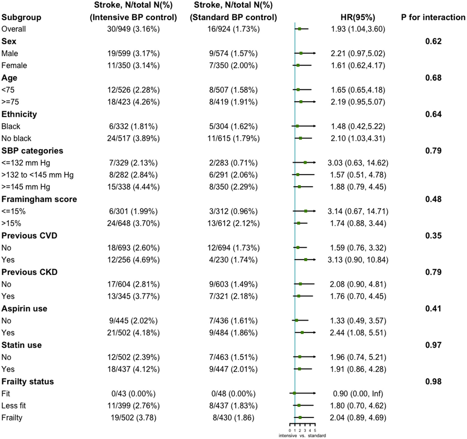 The robustness of the results in various subgroups [gender, age, ethnicity, systolic blood pressure categories, Framingham 10-year CVD risk, previous CVD, previous chronic kidney disease, baseline aspirin use, statin use and frailty status] were also evaluated by stratified analyses and interaction tests.