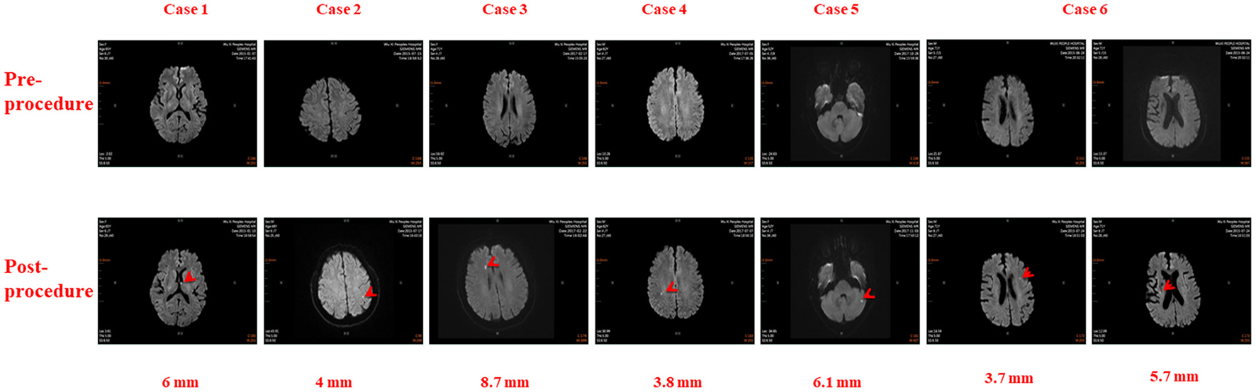 A cerebral MRI was performed within 48 h before and after each PVI procedure using GE Sigma Excite 1.5 or 3.0 T scanners (Magnetom Aera, Siemens Healthcare, Erlangen, Germany or Magnetom Trio, Siemens Medical Solution, Erlangen, Germany) as previously reported (20). Diffusion-weighted MRI (DW-MRI) images from before and after the AF ablation procedure were analyzed and compared to identify any procedure-related acute cerebral lesions. Acute cerebral lesions were defined as the presence of focal diffusion abnormalities (bright hyper-intense lesions) in either a cortical or subcortical location, or in the vascular territory of the perforating arteries. The location and sizes of focal diffusion abnormalities were analyzed. Locations were categorized as: (1) left or right hemisphere and (2) locations within the (a) the frontal lobe, (b) parietal lobe, (c) temporal lobe, (d) precentral gyrus, (e) occipital lobe, (f) postcentral gyrus, or (g) cerebellum. The sizes of SCEs were defined as small (≤ 3 mm maximum diameter), medium (3 to 10 mm) and large (≥10 mm). In the case of differing DW-MRI readings, a consensus was obtained. All DW-MRI data, including number, location, and size of embolic lesions, were analyzed independently by two experienced radiologists who were blinded to the study data. No differences in evaluation, classification, or quantitative results were noted between the two experts.