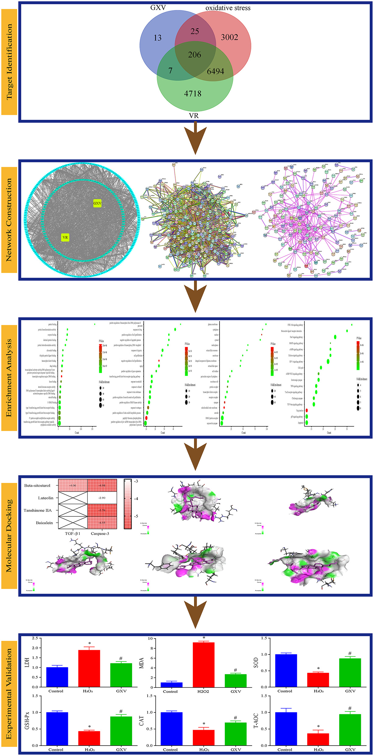 Methods: We applied integrating virtual screening and network pharmacology strategy to obtain the GXV-, VR-, and oxidative stress-related targets at first, and then highlighted the shared targets. We built the networks and conducted enrichment analysis. Finally, the main results were validated by molecular docking and solid experiments.
