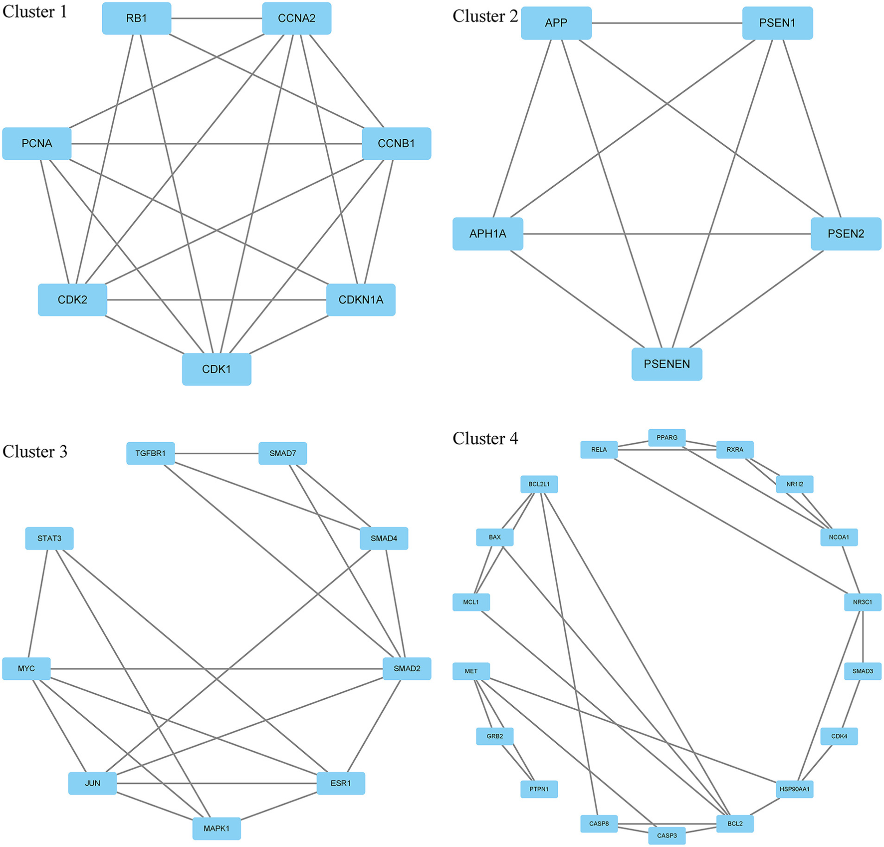 Four cluster networks are divided from the PPI network.