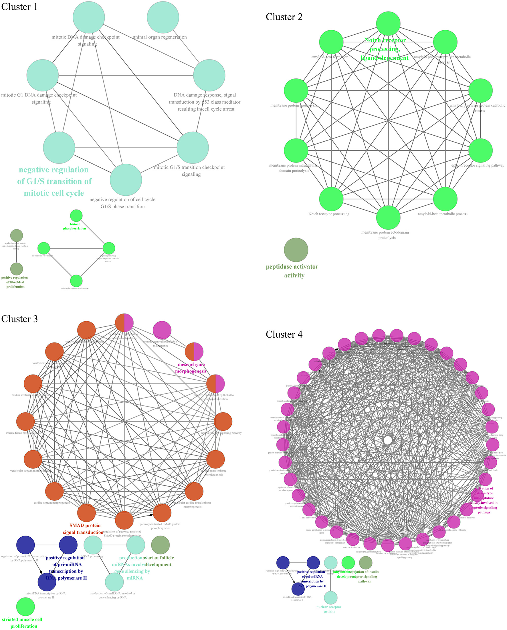 Through GO biological process enrichment of 4 cluster networks from the PPI network, we found that cluster 1 enriched in negative regulation of G1/S transition of the mitotic cell cycle, positive regulation of fibroblast proliferation, and histone phosphorylation; cluster 2 enriched in Notch receptor processing and peptidase activator activity; cluster 3 enriched in SMAD protein signal transduction, mesenchyme morphogenesis, striated muscle cell proliferation, positive regulation of pri-miRNA transcription by RNA polymerase II, and production of miRNAs involved in gene silencing by miRNA; and cluster 4 enriched in activation of cysteine-type endopeptidase activity involved in the apoptotic signaling pathway, positive regulation of pri-miRNA transcription by RNA polymerase II, nuclear receptor activity, and regulation of insulin receptor signaling pathway (Figure 6, Supplementary Table S1).