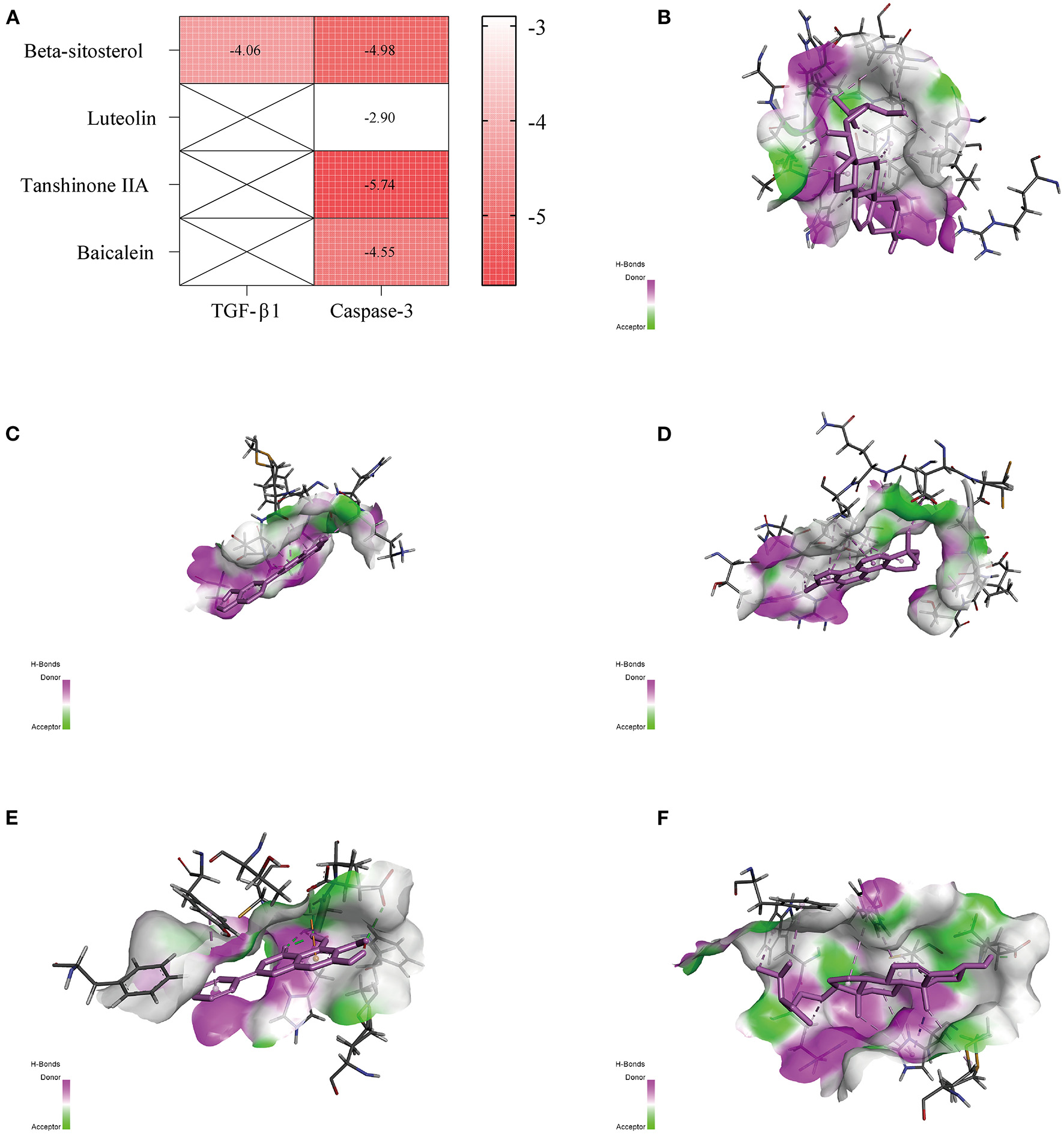 Molecular docking. (A) Heatmap of binding energy. (B) Transforming growth factor (TGF)-β1 and Beta-Sitosterol. (C) Caspase-3 and Luteolin. (D) Caspase-3 and Tanshinone IIA. (E) Caspase-3 and Baicalein. (F) Caspase-3 and Beta-Sitosterol.