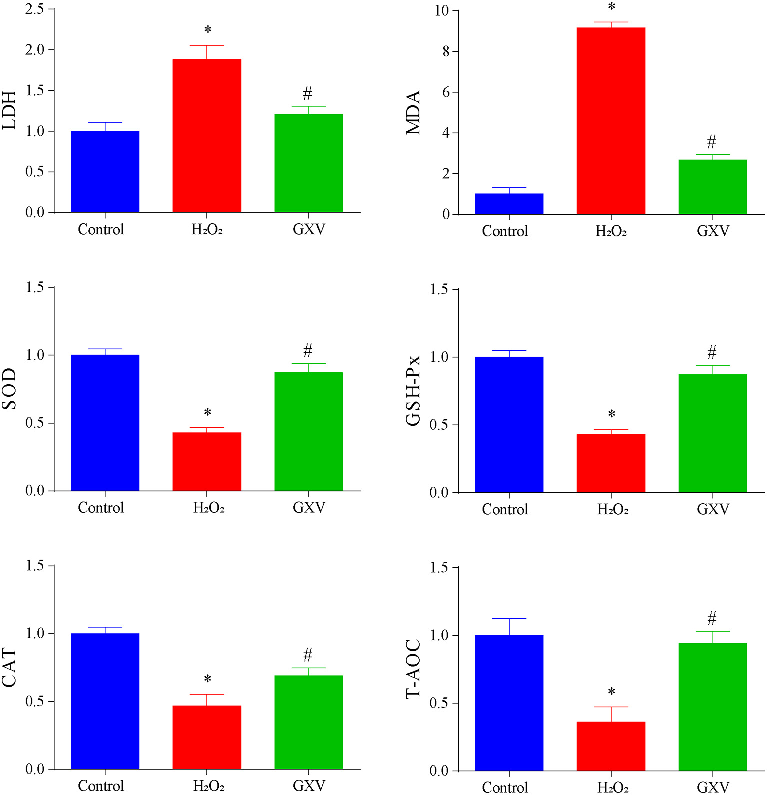 H9c2(2-1) cells incubated with 300 μM H2O2 had increased LDH and MDA and decreased SOD, GSH-Px, CAT, and T-AOC (Figure 8) indicating that the level of oxidative stress was elevated. Administration of GXV could reverse the elevated oxidative stress (Figure 8). Together, we concluded that GXV could consider as an antioxidant.