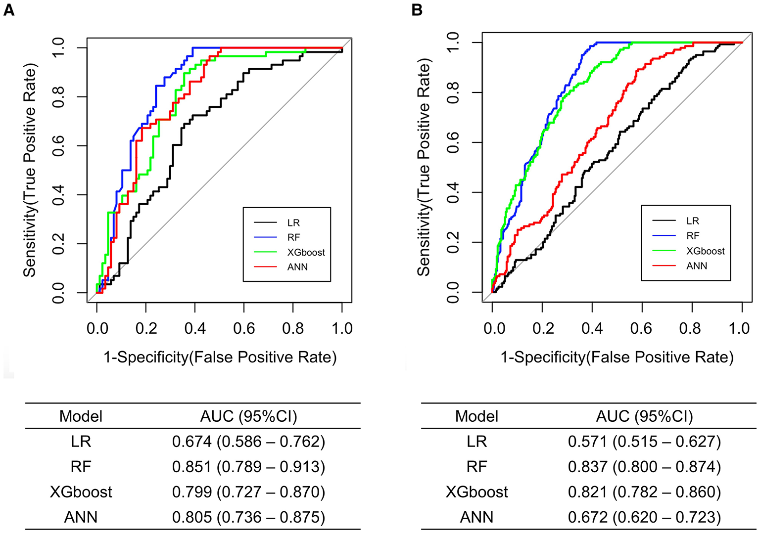 Results: The four models featured high sensitivity and high negative predictive value (NPV) in internal validation (sensitivity = 0.914–1.000; NPV = 0.853–1.000) and external validation (sensitivity = 0.950–1.000; NPV = 0.875–1.000). The RF, XGboost, and ANN models showed much higher area under the receiver operating characteristic curve (AUC) (0.799–0.851 in internal validation, 0.672–0.837 in external validation) than the LR model. Among the models, the RF model, composed of 6 predictor variables, had the best overall performance in both internal and external validation (AUC = 0.851 and 0.837; sensitivity = 1.000 and 1.000; specificity = 0.609 and 0.580; NPV = 1.000 and 1.000; accuracy = 0.766 and 0.721, respectively).