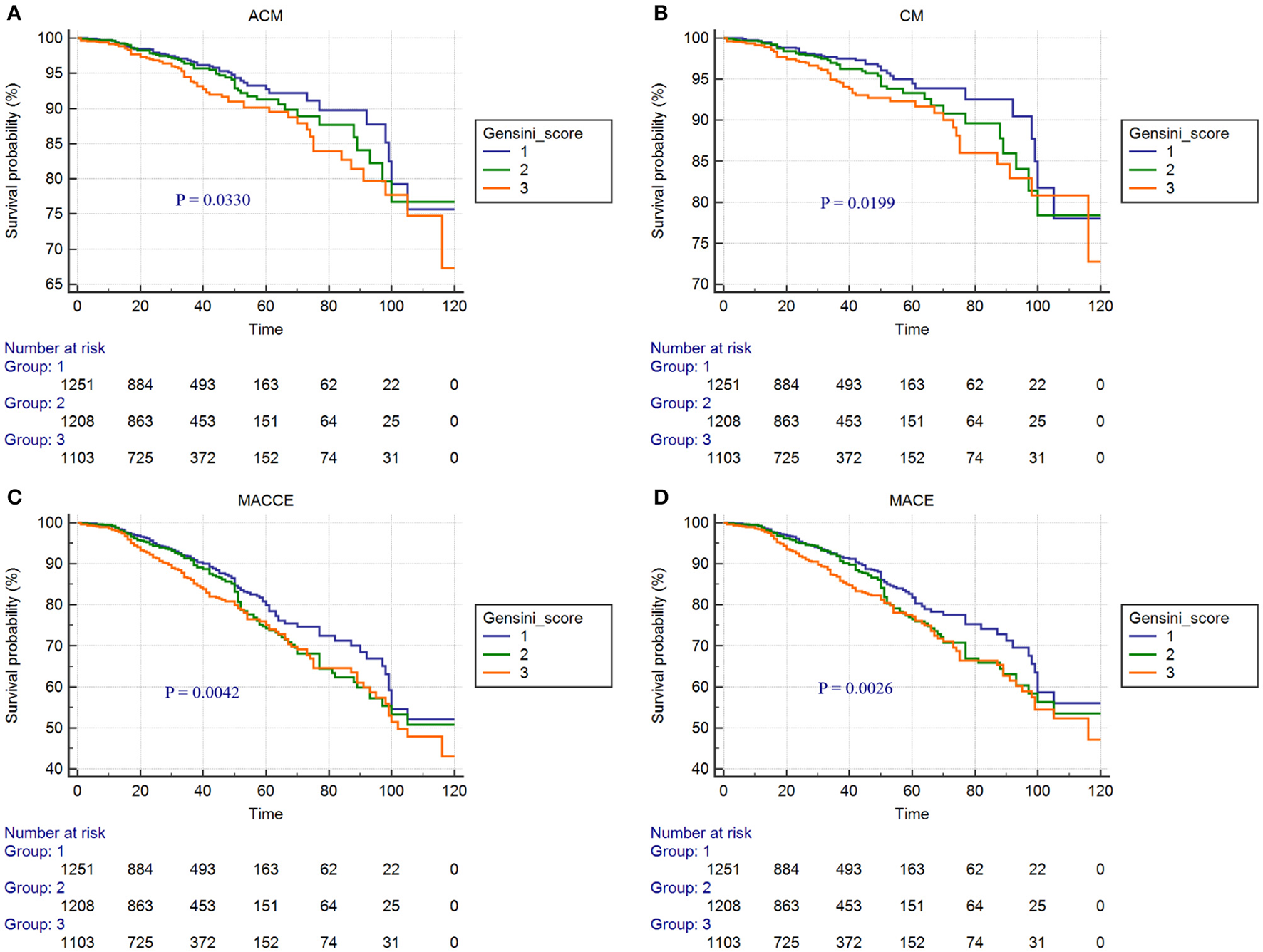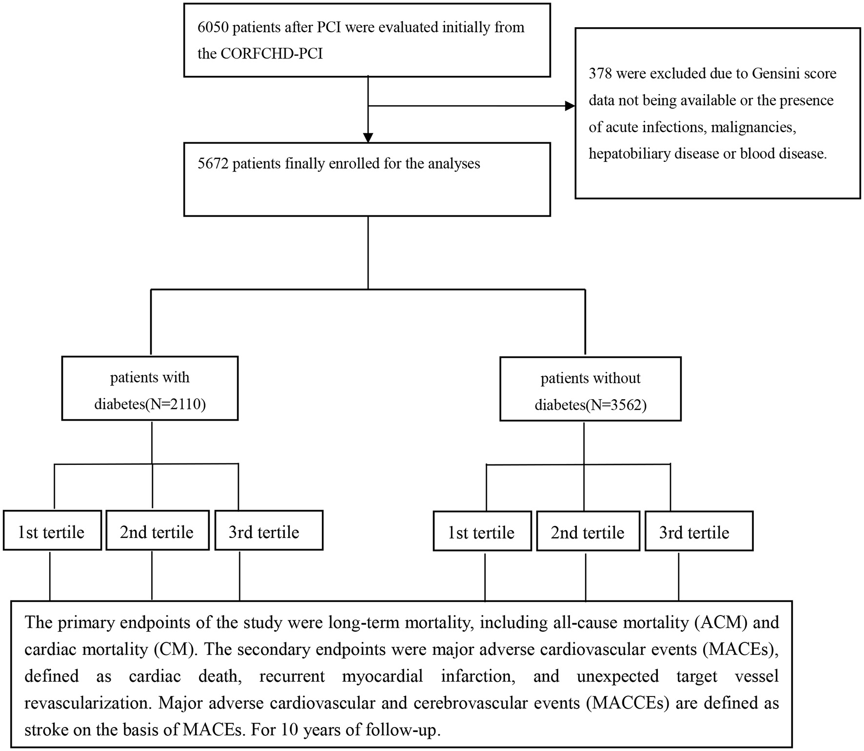 All patients were from the Clinical Outcomes and Risk Factors of Patients with Coronary Heart Disease after PCI (CORFCHD-PCI), a retrospective cohort study involving 5,672 patients with CAD who underwent PCI, such as 2,110 patients with diabetes and 3,562 patients without diabetes, from January 2008 to December 2017. Patients were divided into three groups according to the tertile of Gensini score: first tertile (Gensini score <11 points), second tertile (Gensini score 11–38 points), and third tertile (Gensini score >38 points). The median follow-up time was 31.0 (interquartile range, IQR: 30.0) months. Compared the differences in clinical outcomes between the groups. Multivariate Cox regression analyses were performed to assess the predictive value of the Gensini score for outcomes over up to 10 years of follow-up.