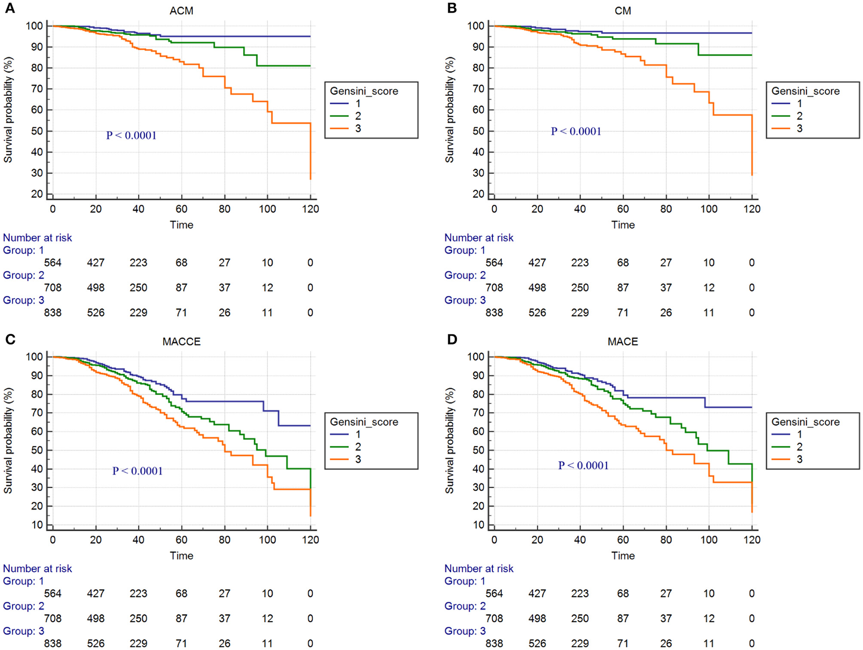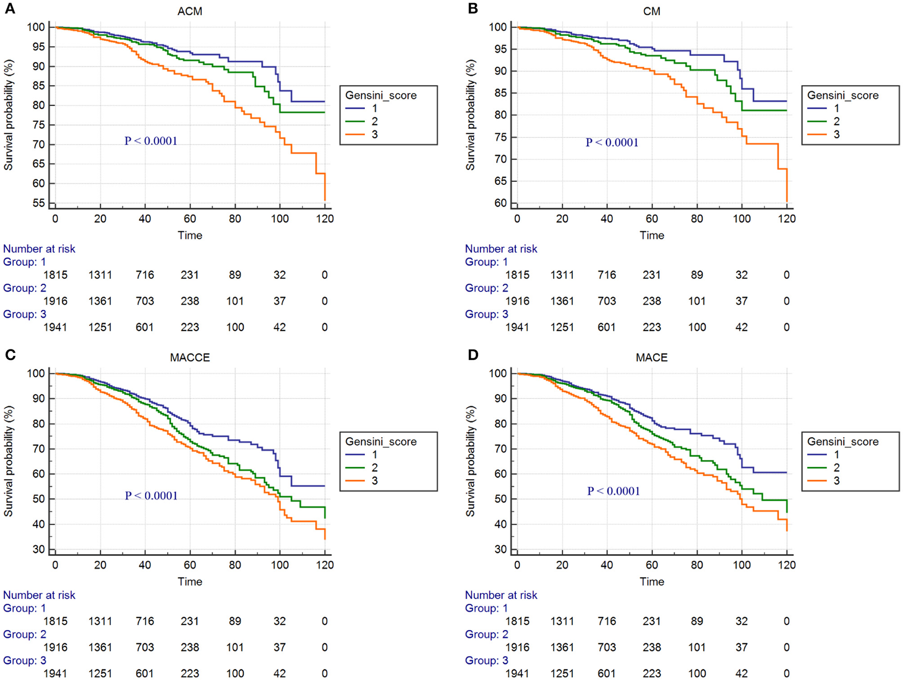 Cox regression stratified analysis of Gensini score and the risk of ACM, CM, MACEs, MACCEs.