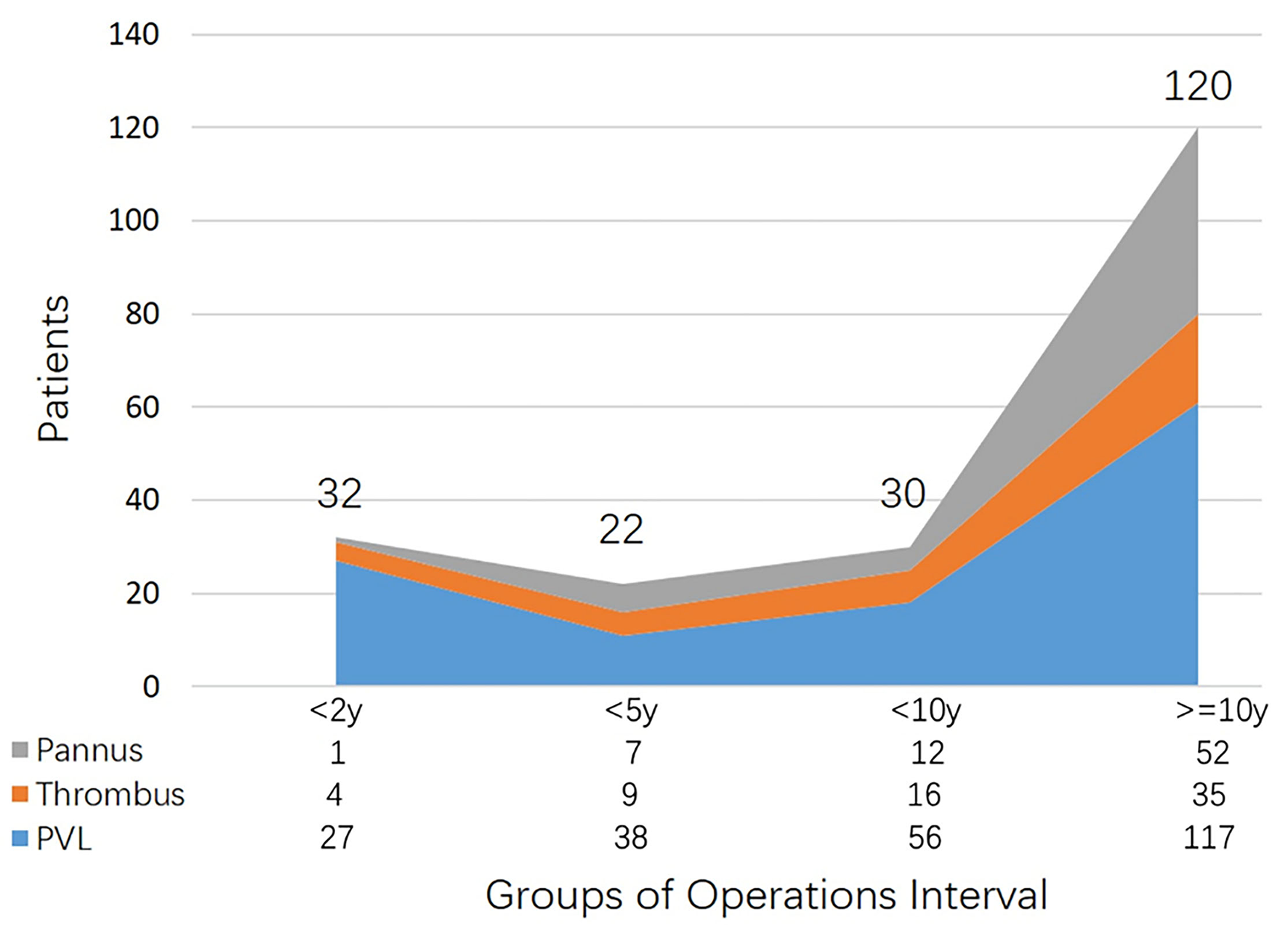 As displayed in Figure 1, more than half of the patients had more than 10 years gap between operations. Especially for patients with pannus, the average interval was 15 ± 8 years, and few of them underwent redo operations <10 years after primary surgery. The majority of PVL patients were in the group “ < 2 years” (n = 27, 84.4%). Moreover, among patients with thrombus, the morbidity of redo surgery appeared to be similar in the entire cohort.