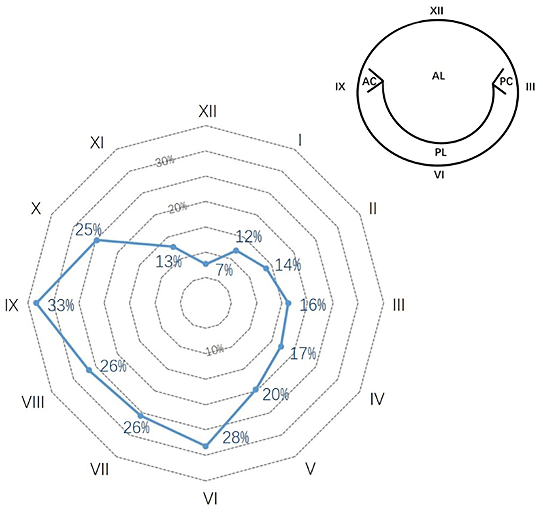 Detailed documentation of perivalvular leakage was available for 109 (93% of PVL group). Figure 2 illustrates the distribution of perivalvular leakage illustrated by the clock position on a radar chart. Eighty-one patients (74% of PVL records) had more than one point of lesion. The most susceptible regions appeared from six to ten o'clock, with a prevalence of no <25%.