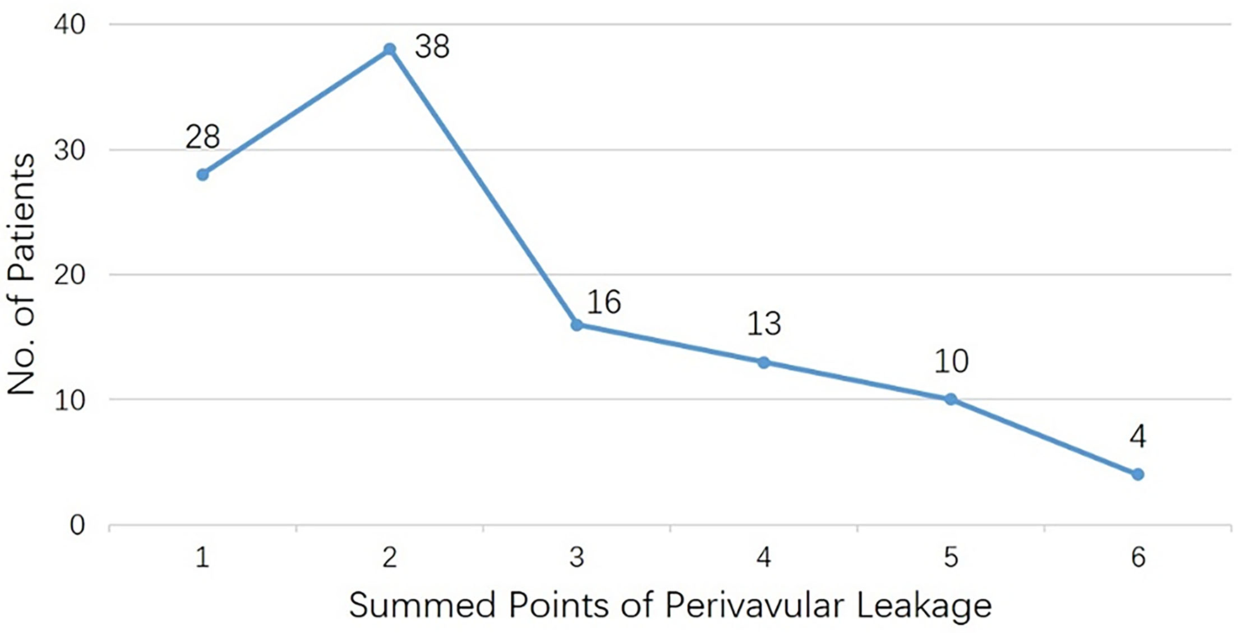 We used a novel item, “summed points of PVL,” to evaluate the severity of perivalvular leakage, representing the lesion's overall points by clock position. Generally, patients were found to have 2.6 ± 1.4 points (Figure 3), and it had no relationship with the interval of operations (r = 0.06, p = 0.56). Furthermore, we analyzed the PVL patients combined with AVR simultaneously and found no relationship between “summed points of PVL” and “aortic valve replacement” (eight of one point, eight of two summed points, and seven of more than two points, p = 0.797).