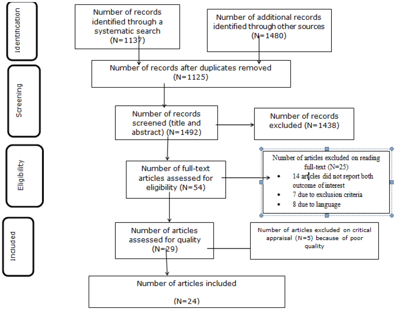 Initially, a total of 1,137 studies were retrieved from the electronic databases and 1,480 articles were retrieved through manual searching. The total number of articles retrieved through an electronic database and manual searching was 2,617. From this, 1,125 were duplicates and removed from this systemic review. The remaining 1,492 articles were screened by their title and abstract and 1,438 irrelevant studies were removed. Then, 54 full-text articles were assessed for eligibility and 14 of them were excluded on the account of not reporting the outcome of interest, 7 studies were excluded due to exclusion criteria, and 8 studies were excluded due to language. Thereafter, 5 articles were excluded upon evaluation against the critical appraisal checklist of prevalence studies (23). Finally, 24 studies were included in this systematic review with meta-analysis (Figure 1).