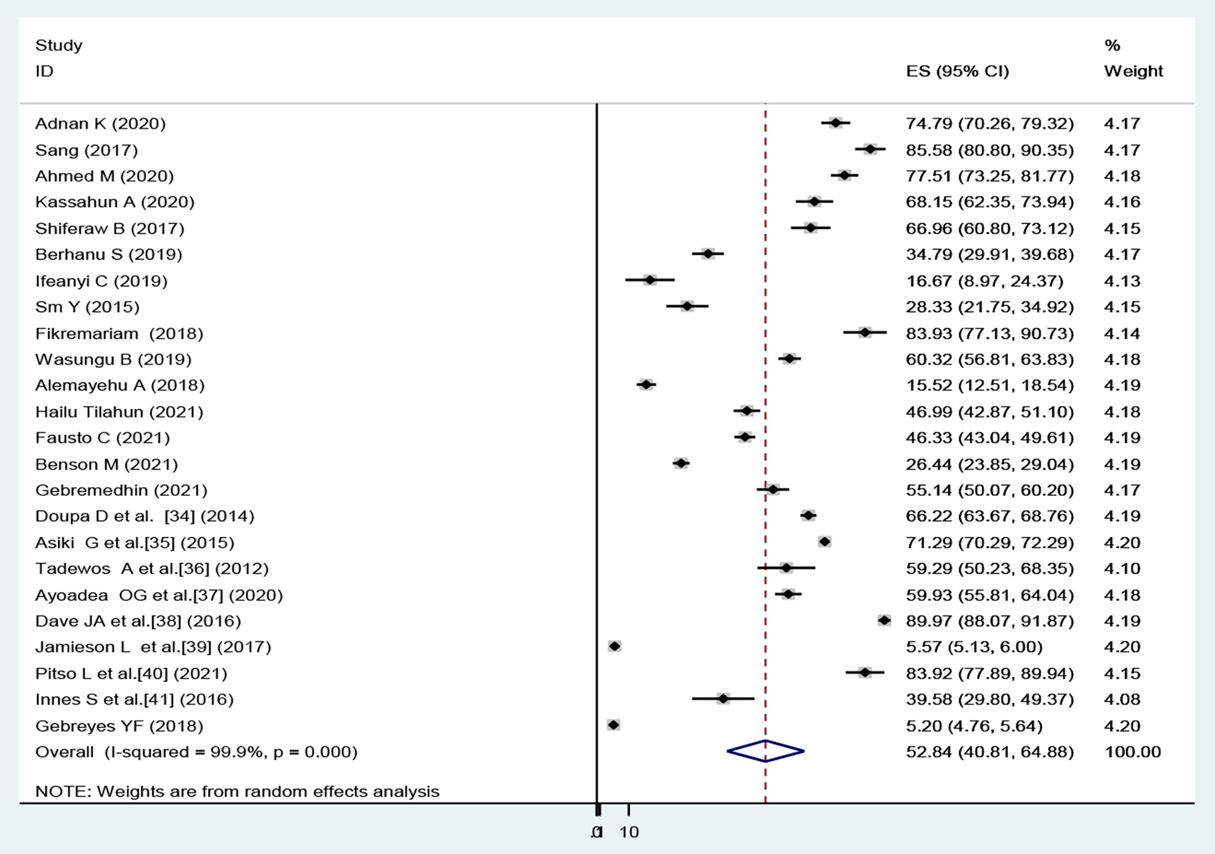 | Tadewos et al. (44) | 2012 | Ethiopia | East Africa | HIV | Comparative | 113 | 67 | 48.7 |