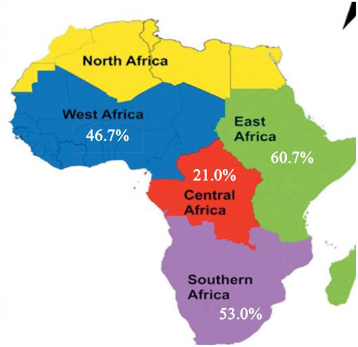 A subgroup analysis by the region showed that there was marked variation across the regions of the African continent. The highest prevalence of dyslipidemia found in East Africa was 60.8 [(95% CI: 35.5–86.0), I2 = 99.9, p < 0.001] and Southern Africa was 53.1 (95% CI: 6.1–99.4), I2 = 100%, p < 0.001). The pooled prevalence of dyslipidemia in western Africa and Central Africa was 46.7 (95% CI: 32.4–60.9), I2 = 98.3, p < 0.001) and 21.0 (95% CI: 10.3–31.7), I2 = 96.5, p < 0.001), respectively. Out of 24 included studies, 12 studies were from East Africa, 5 studies were from western Africa, 5 studies were from southern Africa, and two studies were from central Africa. But, not a single study was included from the northern African region (Figure 3).