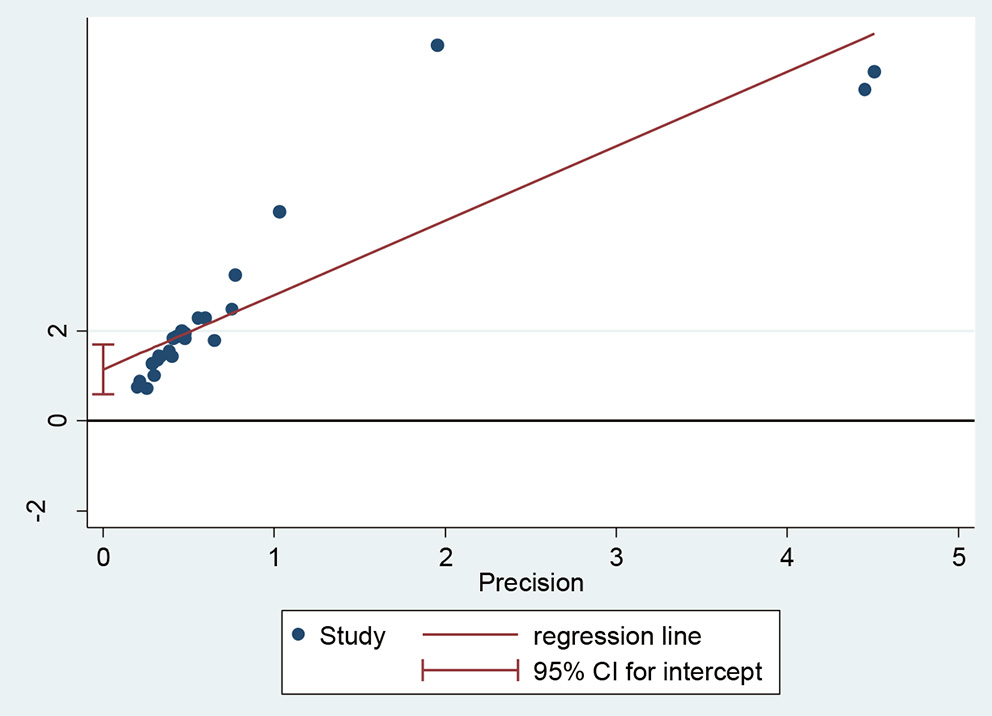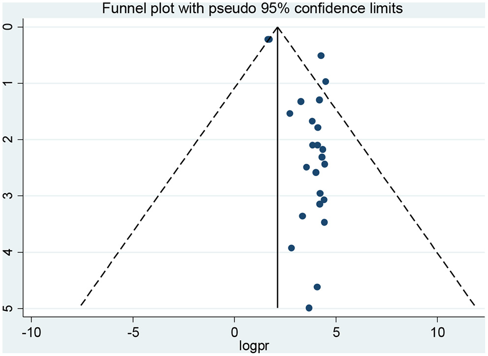 We applied meta regression to identify the source of heterogeneity. Accordingly, random-effects meta regression was conducted by considering the year of publication, prevalence, and sample size as covariates. The analysis indicated that heterogeneity was explained by prevalence (p = 0.02) (Table 3).