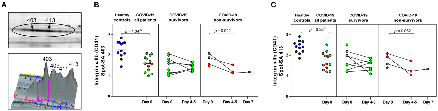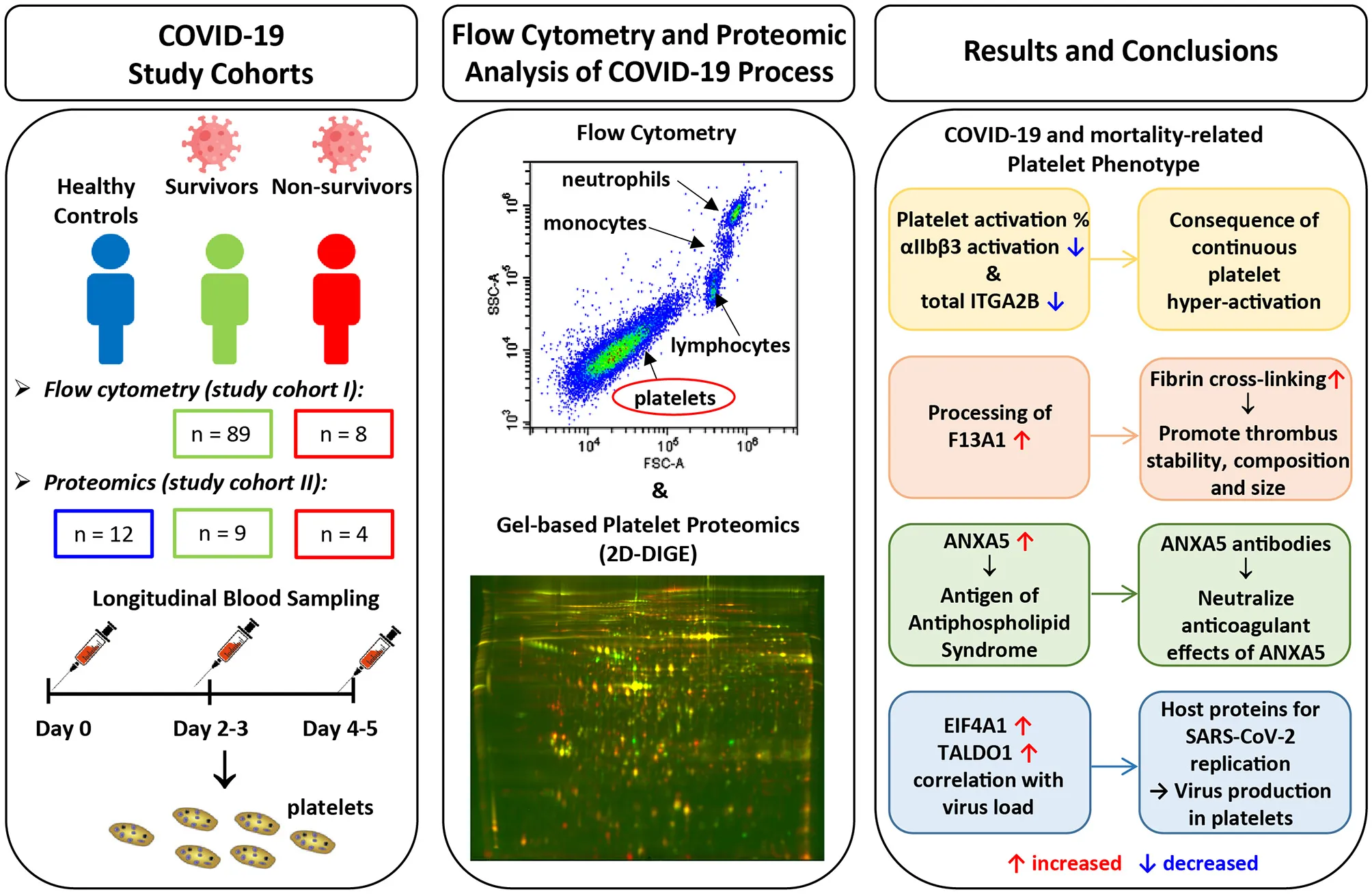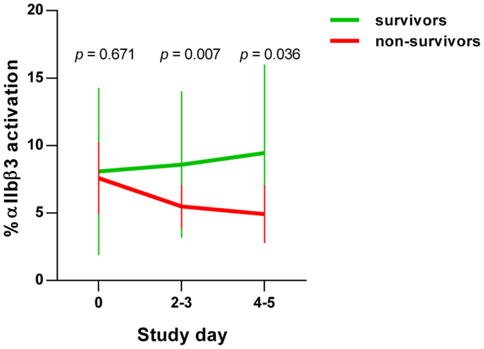 Methods: The COVID-19-related platelet phenotype was examined by analyzing their basal activation state via integrin αIIbβ3 activation using flow cytometry and the proteome by unbiased two-dimensional differential in-gel fluorescence electrophoresis. In total we monitored 98 surviving and 12 non-surviving COVID-19 patients over 5 days of hospital stay and compared them to healthy controls (n = 12).