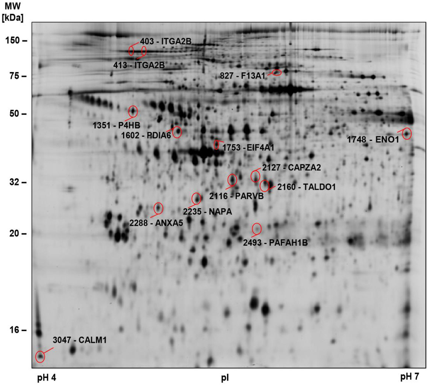 For two-dimensional Western blot (2-D WB) analysis, 30 μg Cy2-labeld platelet proteins were separated by IEF on a 24 cm pH 4–7 IPG strip as described for 2D-DIGE gels, and subsequently transferred onto a PVDF membrane (75 V, 90 min). The membranes were blocked with 5% non-fat dry milk (BioRad, Hercules, CA, USA) in 1x PBS containing 0.3% Tween-20 (PBS-T) over night at 4°C under gentle shaking. Membranes were washed (PBS-T, 3x 5 min) and incubated with monoclonal anti-Factor F13A1 antibody (1:250 in PBS-T containing 3% non-fat dry milk; ab1834; Abcam, USA) for 2 h at RT (180 rpm). After washing (PBS-T, 3x 5 min), the membranes were incubated with a horseradish peroxidase (HRP)- conjugated secondary antibody (1:20,000 in PBS-T containing 3% non-fat dry milk) for 1.5 h in the dark at RT (65 rpm). Membranes were washed again (2x 5 min in PBS-T, 1x 5 min in PBS) and the HRP signal was detected using an Enhanced Chemiluminescent substrate (FluorChem® HD2, Alpha Innotech, CA, USA).