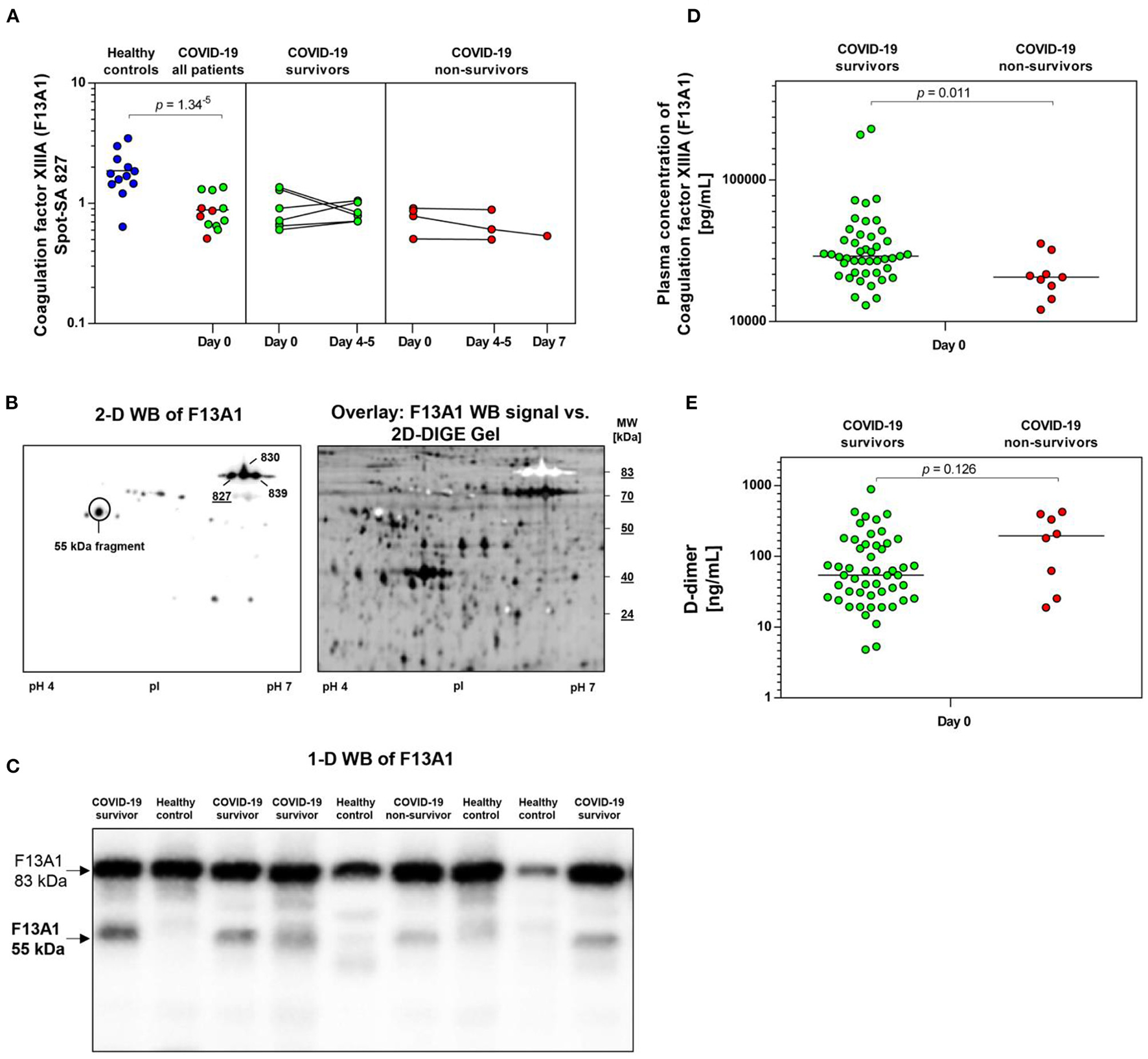 For explorative statistical analysis, only 2D-DIGE protein image spots were included which could be matched by the IS spot map with more than 95% of all 2-D platelet proteome maps of this study. This quality selection limits the resulting protein spots to 420 out of an average of 2100 spot events matched with the master gel. One-way analysis of variance (ANOVA) was calculated for these 420 reliably matched spots between the five study groups (COVID-19 survivors day 0, COVID-19 non-survivors day 0, COVID-19 survivors day 4–5, COVID-19 non-survivors day 4–5, and healthy controls). Significant differences between control group and COVID-19 patients and between patients with different outcome were analyzed by planned contrasts analysis in SPSS Statistics 25 (SPSS Inc, Chicago, USA). Graphs were created with GraphPad Prism 7 (GraphPad Software, Inc. San Diego California, USA).