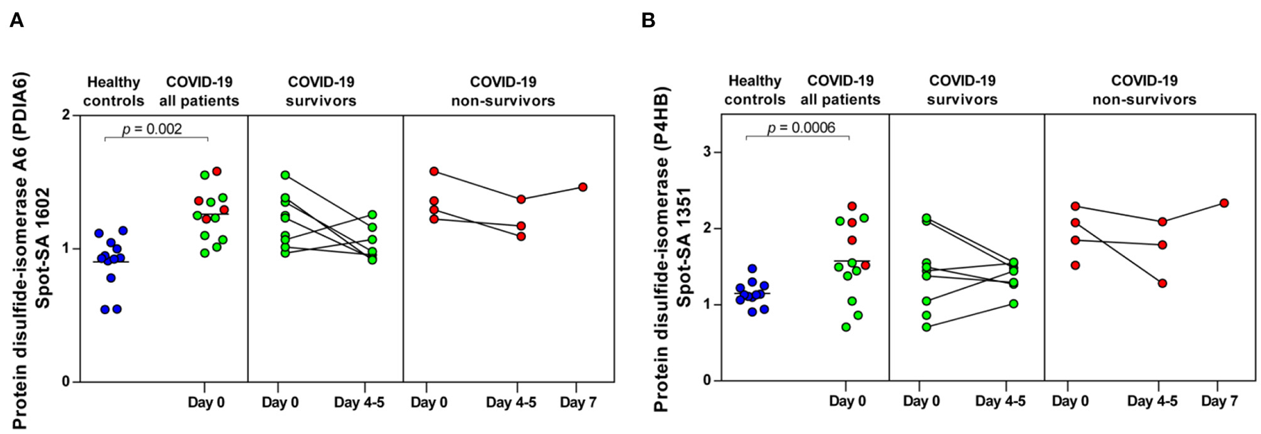 It is also noteworthy that platelet exhaustion and hypo-responsiveness of platelets have been observed in COVID-19 patients. Platelets of COVID-19 patients show hypo-reactivity in response to in-vitro stimulation (9, 29, 30, 32, 33), indicating prior platelet hyper-activation and resulting hypo-responsiveness in COVID-19 patients (34). However, little is known about more detailed molecular changes in platelets in the context of SARS-CoV-2 infection and the course of the disease. Therefore, the aim of this study was to decipher specific changes in platelet function associated with COVID-19 as well as between COVID-19 survivors and non-survivors. We analyzed platelet activation status by means of flow cytometry and platelet proteome using 2D-DIGE technology over a period of 5 days in a cohort of hospitalized COVID-19 patients.