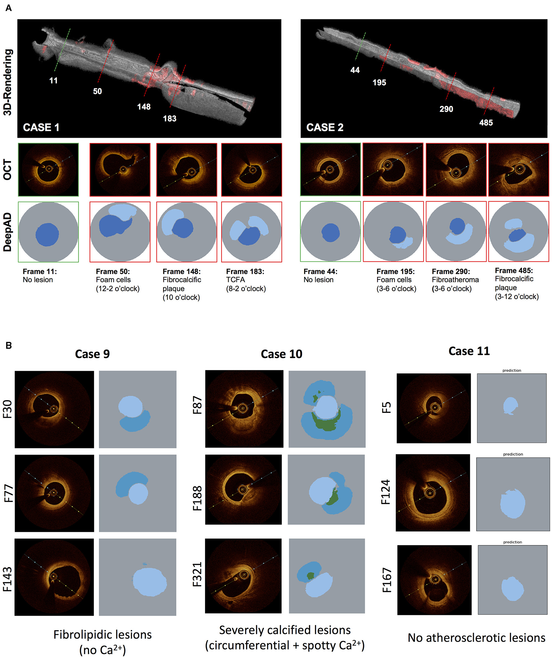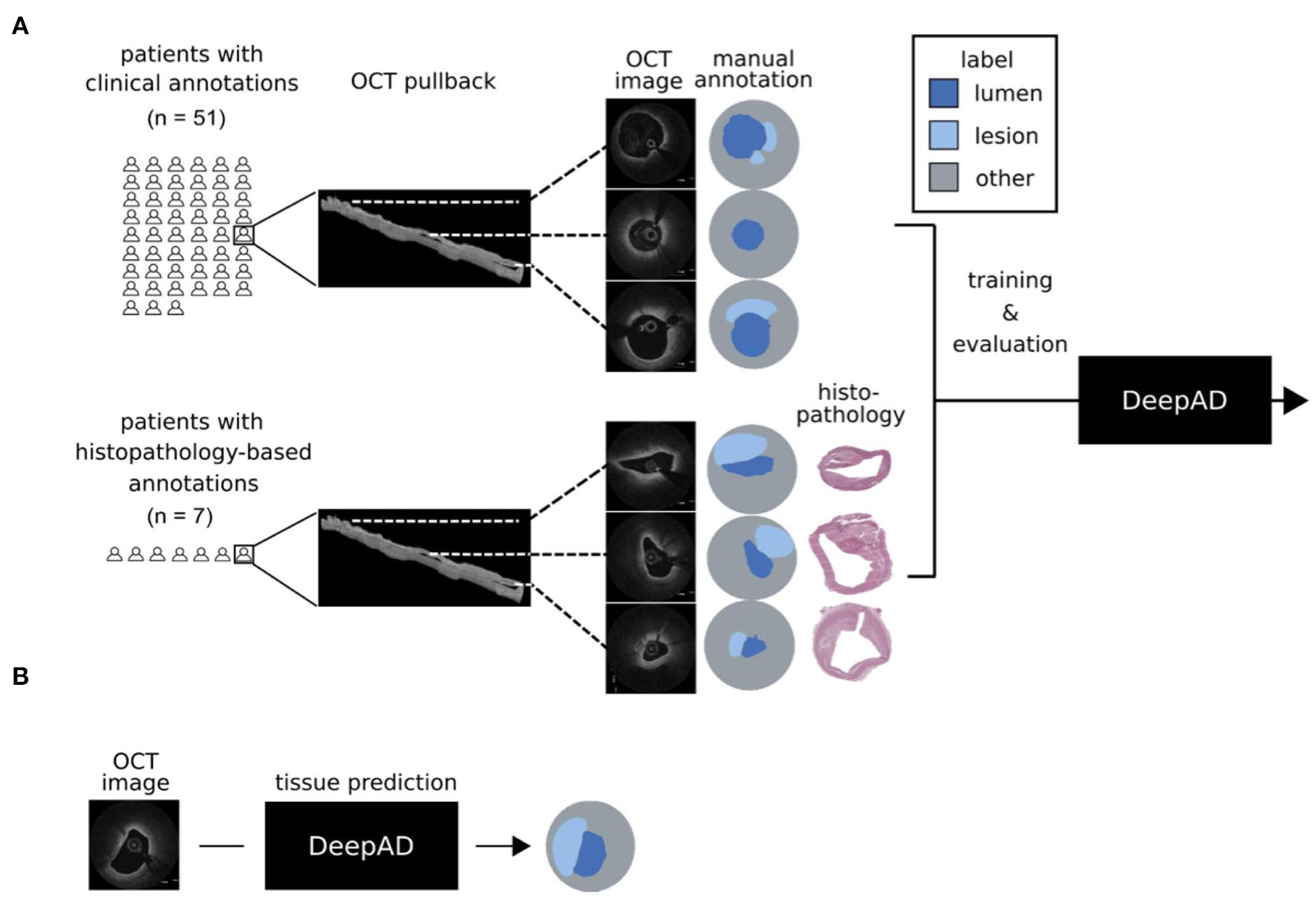 Coronary artery disease is the leading cause of death worldwide, accounting for the majority of acute coronary syndromes and sudden cardiac deaths. Identification of atherosclerotic tissue might allow stratification of patients at risk for future coronary events (1–3). Invasive assessment of the coronary arteries using high-resolution intravascular imaging has emerged as an important tool for identifying atherosclerotic lesions (4), as the close proximity of the imaging catheter allows a more precise and high-resolution visualization of the vascular tissue compared to non-invasive modalities (5). The main advantage of optical coherence tomography (OCT) in comparison to other imaging modalities such as intravascular ultrasound (IVUS) is its superb resolution of 10–20 μm with a tissue penetration of approximately 2–3 mm, which enables clear visualization of atherosclerotic components such as lipid tissue with foam cell infiltration or calcifications (5, 6). However, assessment and evaluation of OCT is currently based on clinical expertise from skilled interventionalists and pitfalls in plaque characterization can lead to misclassification (7, 8). Additionally, each volume of OCT images obtained in one measurement, also called a pullback, generates a vast amount of data, precluding from analog assessment of single frames. Due to the high clinical relevance and the cumbersome manual review, automated or semi-automated approaches for preliminary evaluation of OCT images is of great interest for the interventional community (9–11). For intravascular imaging, several groups demonstrated the possibility of automated plaque characterization using semi-automated approaches such as quantification of various optical signal properties (e.g. light attenuation) (12–15). The feasibility of using deep-learning algorithms for detection and visualization of atherosclerotic plaque components was also demonstrated recently (9, 11, 16–19). In this work, we developed DeepAD, a deep-learning algorithm trained on data with histopathology-based annotations from autopsy specimens as well as clinical OCTs for prediction of atherosclerotic lesions, and evaluated it in dedicated real-world cases (Figure 1).