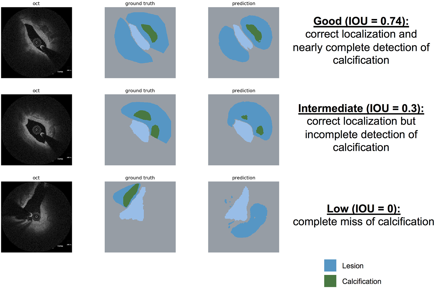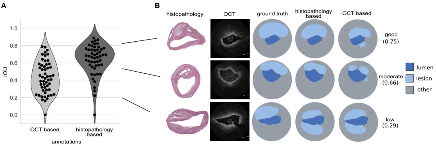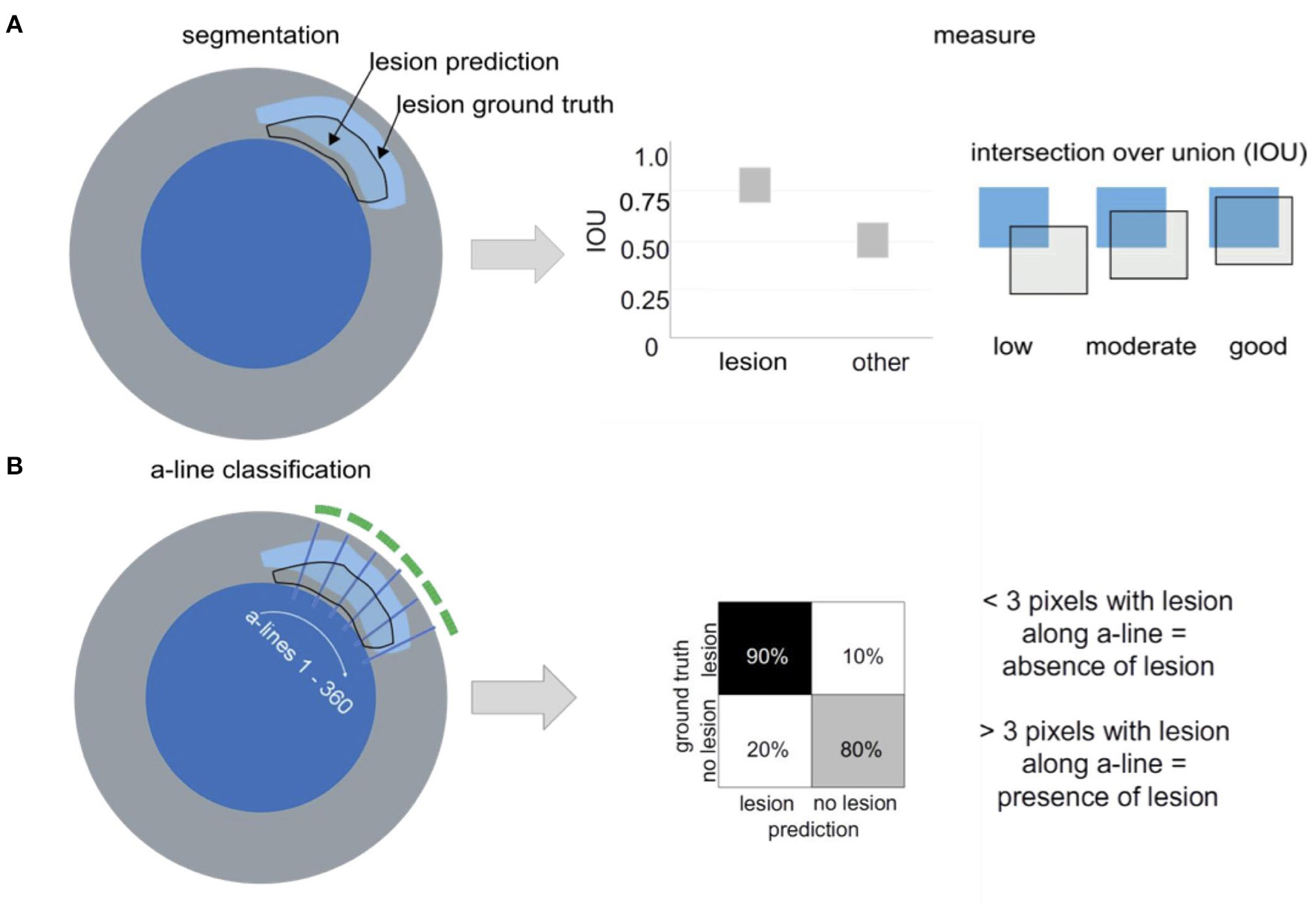 Segmentation describes the task of linking certain regions or pixels within an image to a specific class label (here: lumen, lesion, other). We evaluated the segmentation performance using the intersection over union (IOU, also called Jaccard index), a common metric for evaluation of the quality of segmentation algorithms (28). The IOU is calculated as the overlap between the manual annotation (i.e. the “ground truth”) with the prediction from the algorithm divided by the union (see Figure 2A):