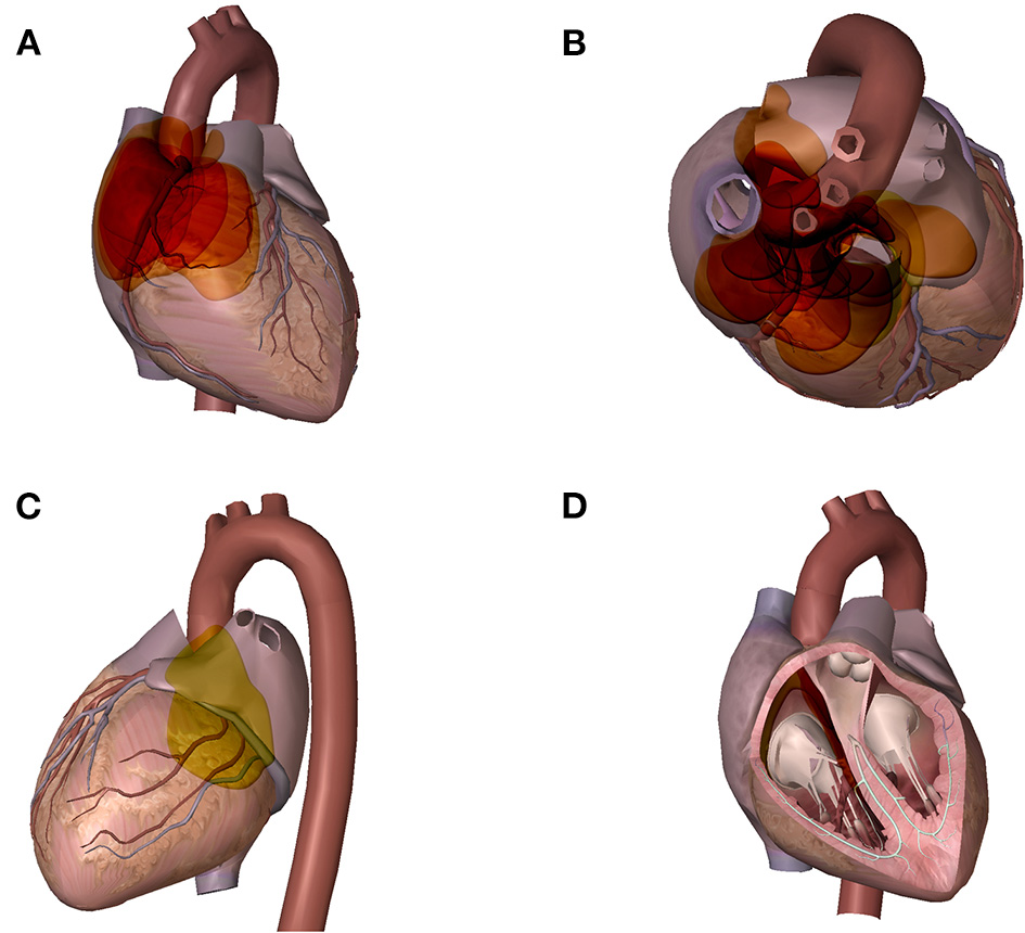 Distribution of GPCLs. A wide variety of the tumor sites could be found in these GPCL patients. Each colored disc represents one tumor, the size, shape, and position of each disc is similar to that of the corresponding tumor. Areas with deeper color indicate areas with higher frequency of tumor. (A) cardiac frontal view: tumors located in the interatrial groove and the root of the vena cava (B) cardiac axial view: tumors located between the ascending aorta and the main pulmonary artery, and in the root of the vena cava (C) cardiac posterior view: tumors located in the atrioventricular groove (D) cardiac chamber view: tumors originated from the atrial septum and located in the cardiac chambers.