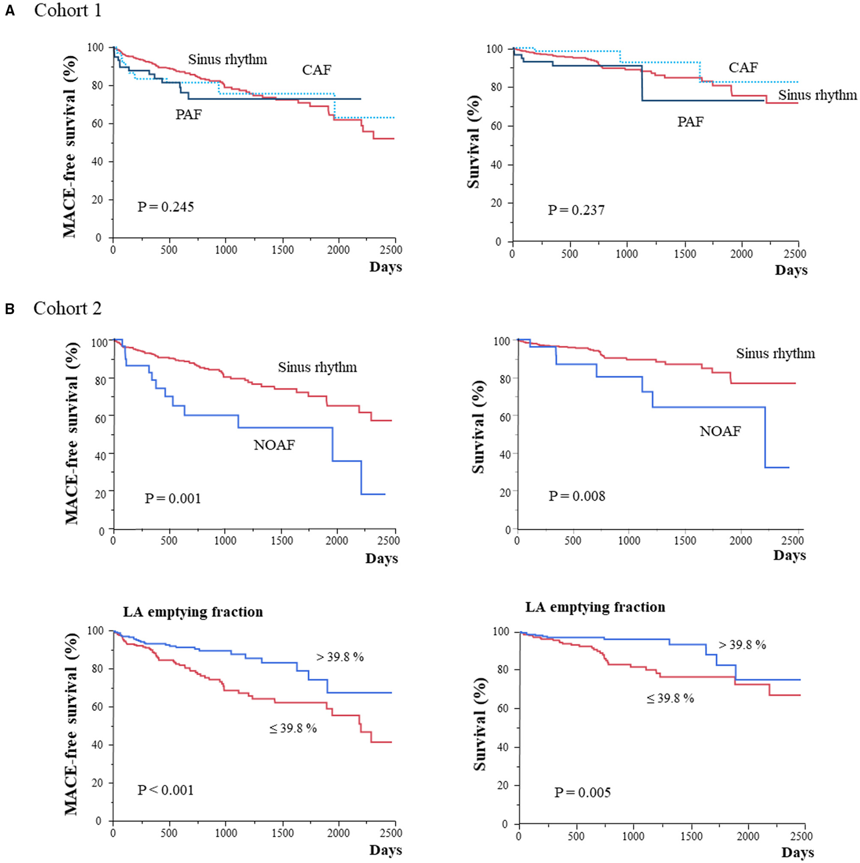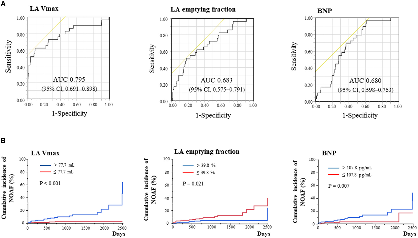 We followed up 492 patients with baseline SR (cohort 2), and 29 (5.9%) patients developed NOAF (NOAF group) over a median follow-up period of 609 days. Table 2 presents the baseline clinical characteristics of the patients in Cohort 2. Significant differences were observed only in BNP levels and LA diameter. Although no significant difference was observed in LV parameters, the NOAF group showed higher LA volumes and lower LA emptying fractions than the SR group. The LA Vmax of the NOAF group was similar to that of the baseline CAF group or PAF group. The LA emptying fraction of the NOAF group was similar to that of the baseline PAF group and higher than that of the baseline CAF group.