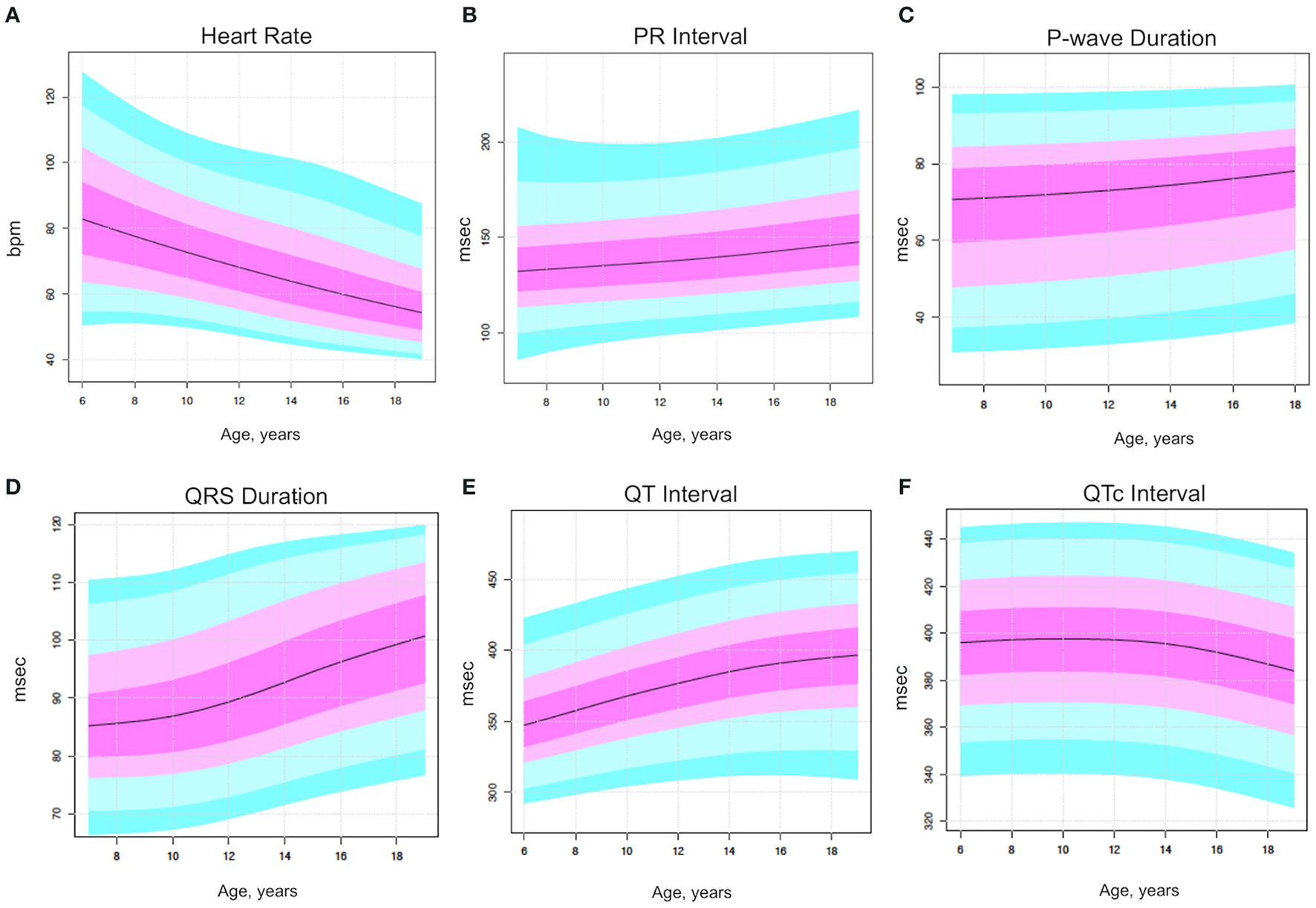 Their heart rate progressively slowed as age increased (p < 0.001, ranging from 80.8 ± 13.2 to 59.5 ± 10.2 bpm), as expected. The P wave, PR interval, and QRS duration significantly increased in older age classes (p = 0.019, p = 0.001, and p < 0.001, respectively), and after Bonferroni's correction, the difference remained significant in all age classes for QRS duration. The QTc interval diminished progressively with increasing age (p = 0.003) while the QT interval increased progressively (p < 0.001).