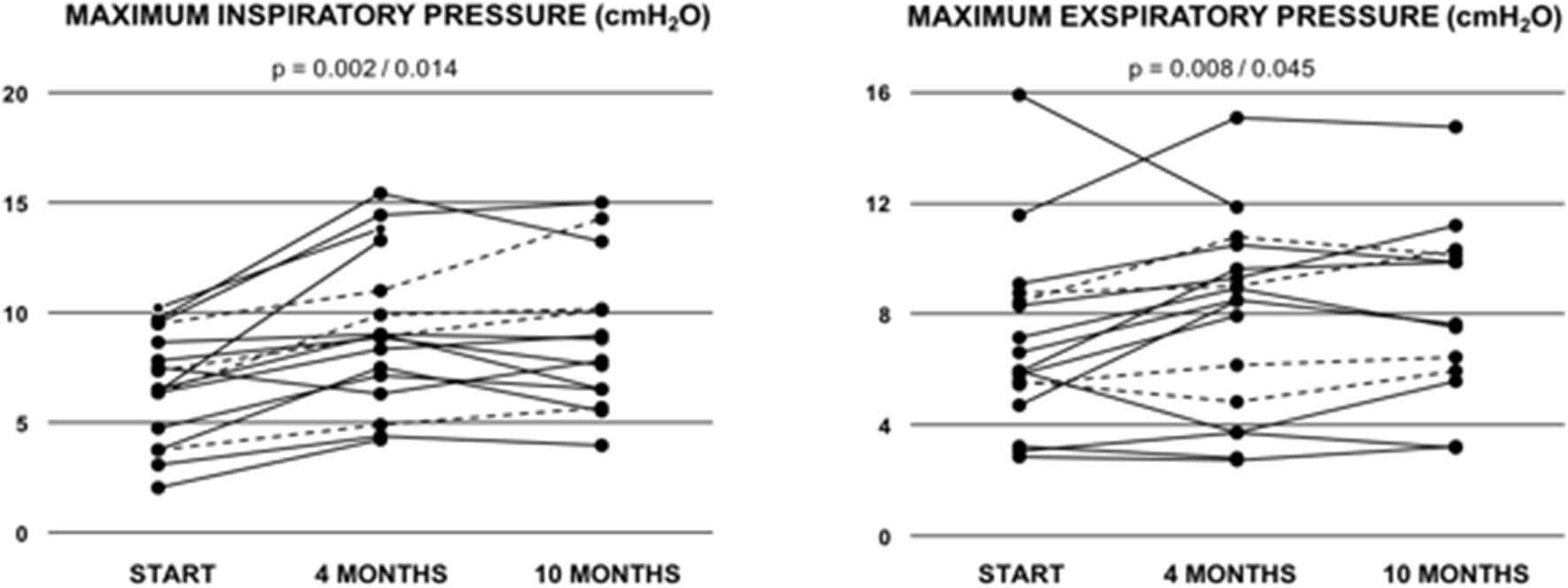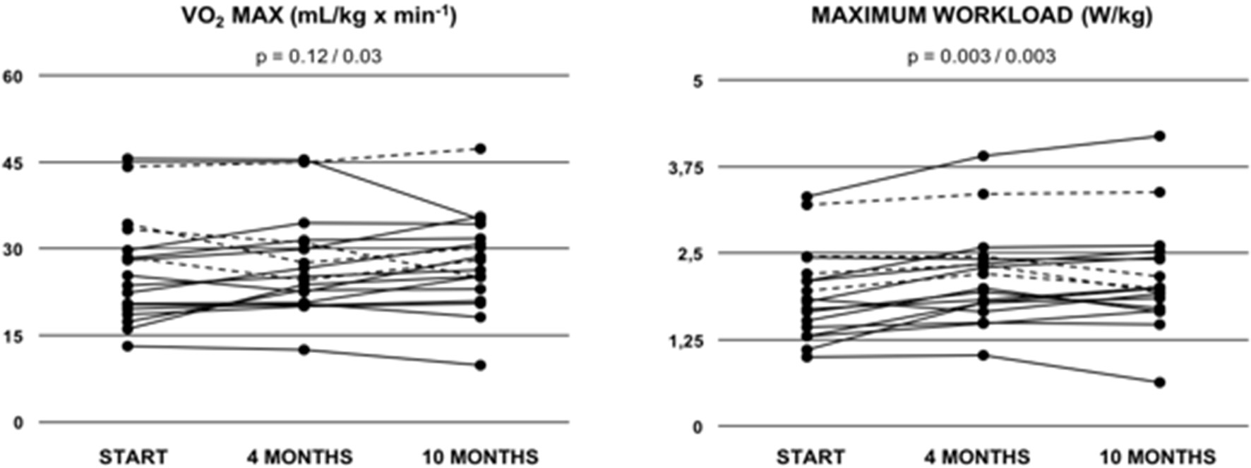 Peak oxygen uptake (VO2 MAX) and maximum relative workload (W/kg) in Fontan patients during the 10-months training period. Values are given at baseline (start), and after 4 and after 10 months of combined endurance and inspiratory muscle training. Each line represents one patient. Full lines represent teenage/adult patients, while dashed lines indicate patients who remained younger than 13 years throughout the study period. The first p-value refers to the total cohort of 18 patients, while the second p-value refers to the teenage/adult subgroup analyses only (n = 14).