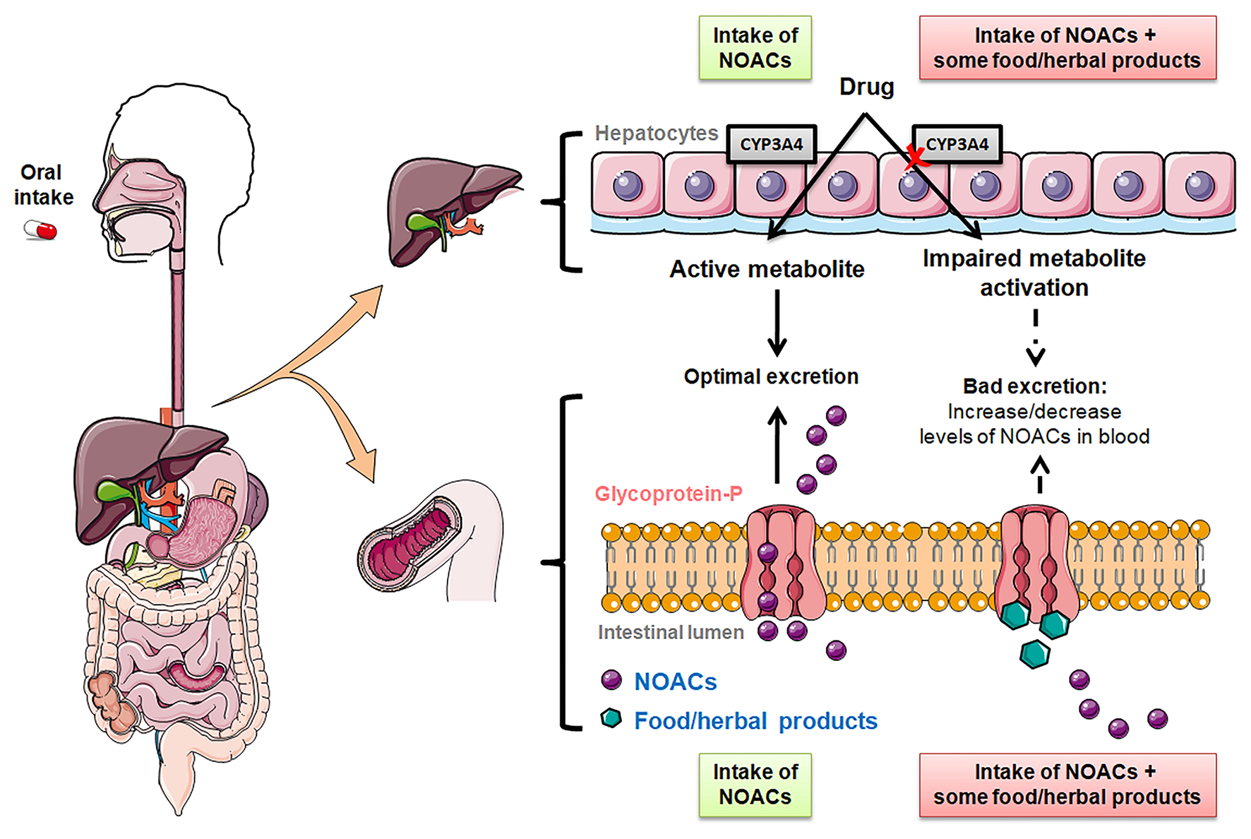 Effect of the intake of food/herbal products on the metabolization of NOACs. Elimination of NOAC mediated by P-glycoprotein and cytochrome P450 (CYP) 3A4 in the intestinal lumen and liver.
