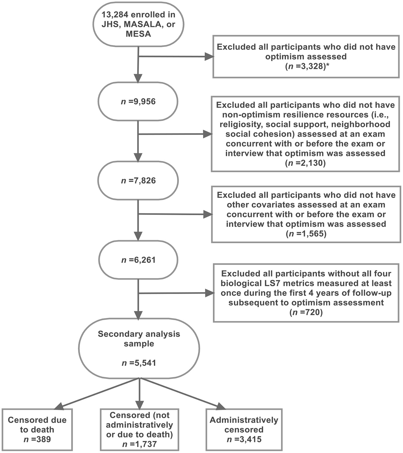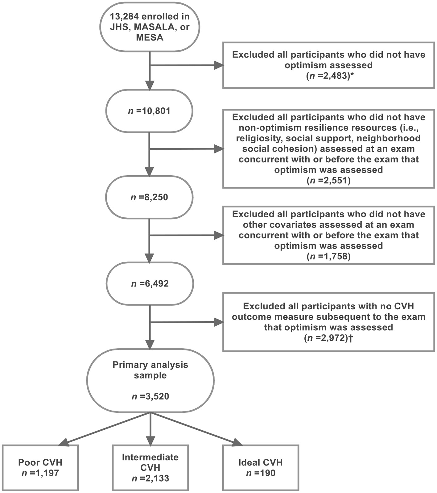 Exclusion criteria applied to identify 3,520 MESA participants who were included in the primary analysis sample. *This exclusion step resulted in the exclusion of all MASALA participants because optimism was not assessed in MASALA. This exclusion step resulted in the exclusion of all remaining JHS participants because Life's Simple 7 (LS7) metrics for CVH outcome was not assessed subsequent to the assessment of optimism in JHS. CVH, cardiovascular health; JHS, Jackson Heart Study; MASALA, Mediators of Atherosclerosis Among South Asians Living in America; MESA, Multi-Ethnic Study of Atherosclerosis.