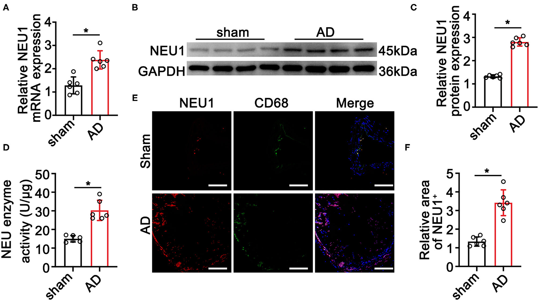 In this study, we found that NEU1 expression was significantly upregulated in dissecting tissues from BAPN-induced AD mice. Additionally, using genetically KO mice, we demonstrated that NEU1 played an important role in the development of AD. Furthermore, the elevated NEU1 expression in macrophages promotes the M1 macrophage polarization. Therefore, NEU1 may become a potential therapeutic target for AD.
