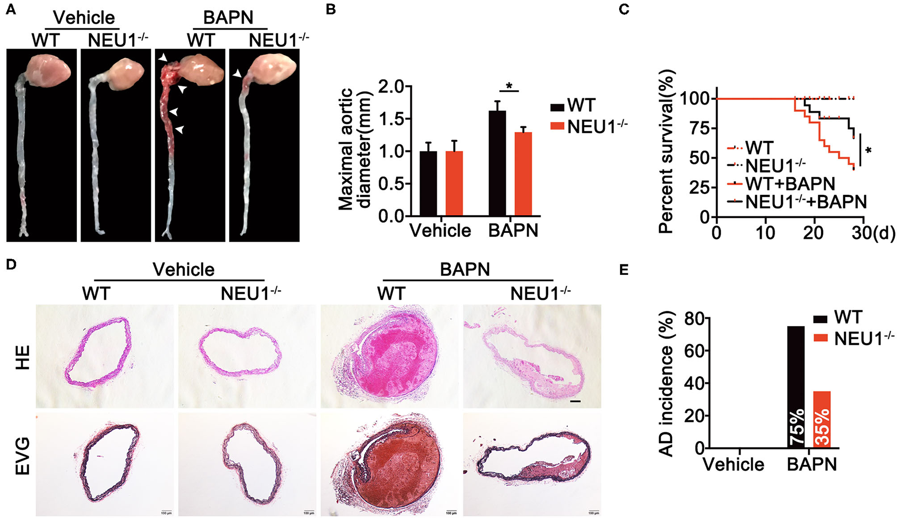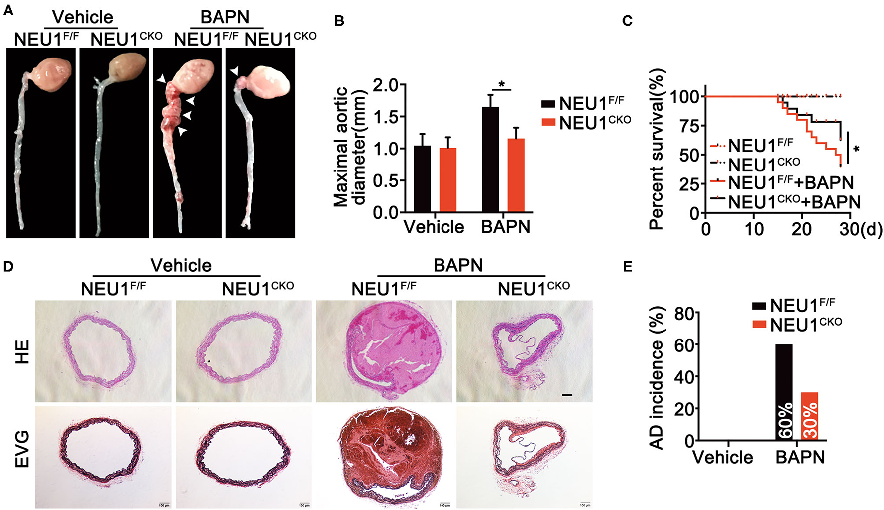 Global NEU1 deletion mitigates BAPN-induced AD development. (A–E), C57BL/6 wild-type and NEU1 KO mice were subjected to BAPN induction. (A) Representative macrographs of the aortas. (B) Maximal aortic diameter (n = 8, *p < 0.05). (C) Kaplan–Meier survival analysis of indicated groups (n = 20, *p < 0.05). (D) Representative HE and EVG staining of the aorta. (E) AD incidence in indicated groups (n = 20). AD, aortic dissecting; BAPN, β-aminopropionitrile monofumarate; EVG, Elastic Van Gieson's staining; HE, hematoxylin and eosin; KO, knockout; NEU1, neuraminidase 1.