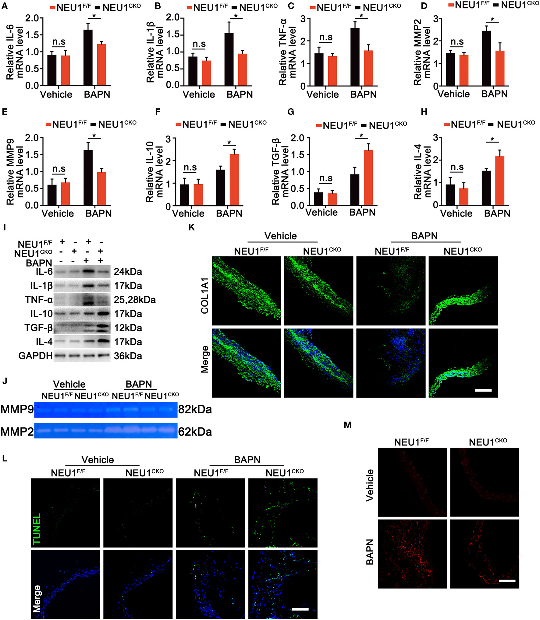 NEU1 depletion suppressed BAPN-induced inflammation. (A–H) Quantitative mRNA levels of pro- and anti-inflammatory factors in aortas of NEU1F/F and NEU1 CKO mice subjected to BAPN induction for 4 weeks (n = 6 per group). (I) Representative western blots of pro- and anti-inflammatory factors in aortas of NEU1F/F and NEU1 CKO mice subjected to BAPN induction for 4 weeks (n = 6 per group). (J) Gelatin zymogram analysis of MMP2 and MMP9 activity levels in aortas of NEU1F/F and NEU1 CKO mice subjected to BAPN induction for 4 weeks. (K) Immunofluorescence images of COL1A1 in aortas of NEU1F/F and NEU1 CKO mice subjected to BAPN induction for 4 weeks (scale bar: 50 μm). (L) TUNEL staining of aortas from NEU1F/F and NEU1 CKO mice subjected to BAPN induction (scale bar: 50 μm). (M) DHE staining of aortas from NEU1F/F and NEU1 CKO mice subjected to BAPN induction for 4 weeks (scale bar: 50 μm). BAPN, β-aminopropionitrile monofumarate; DHE, dihydroethidium; KO, knockout; MMP, matrix metalloproteinase; NEU1, neuraminidase 1; NEU1 CKO, macrophage-specific NEU1 knockout. *p < 0.05.
