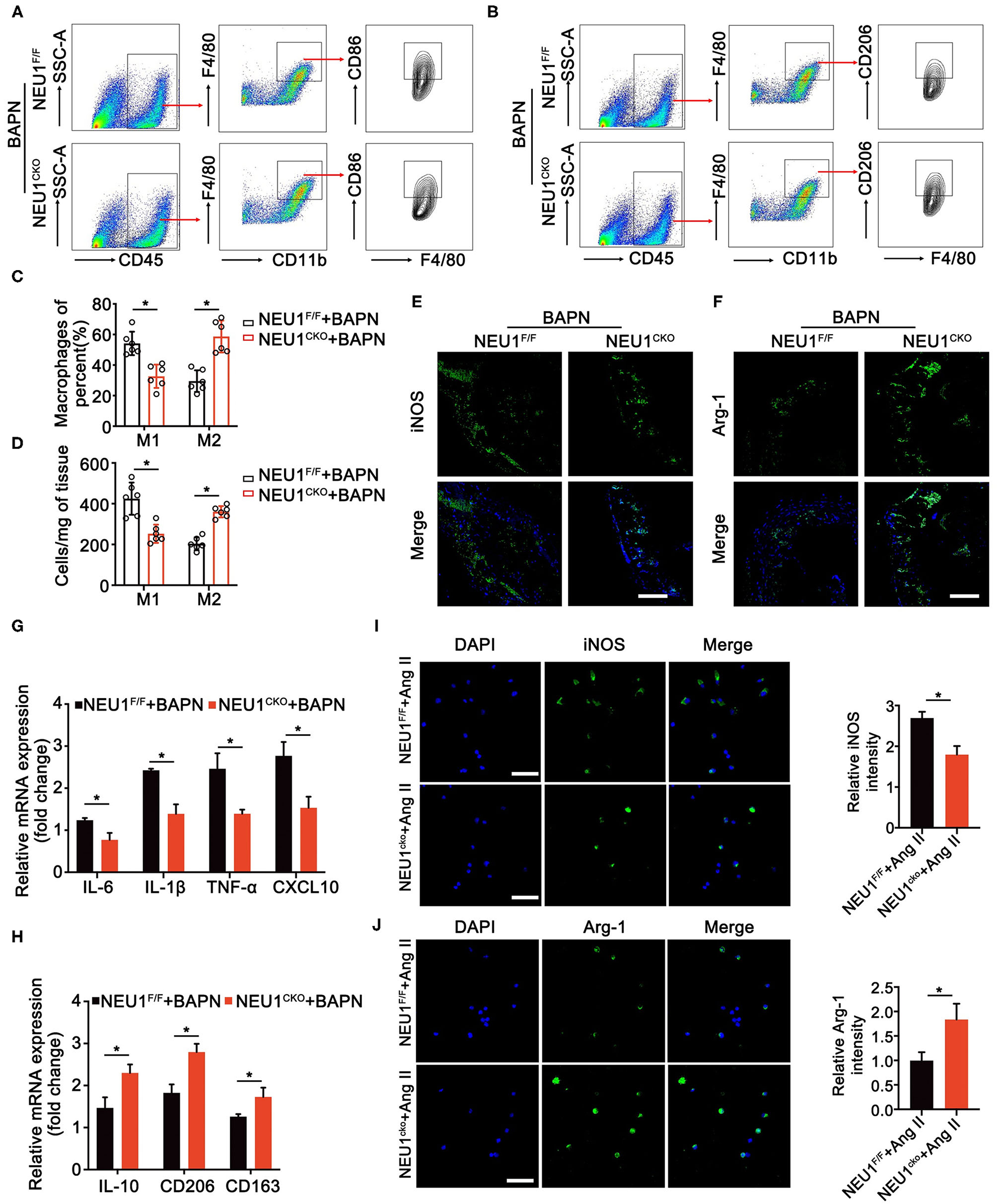 NEU1 deletion promotes the polarization of macrophages. (A,B) Gating strategy for CD45+CD11b+F4/80+ CD86+ M1 macrophages and CD45+CD11b+ F4/80+ CD206+ M2 macrophages in aortas of NEU1 CKO mice and their controls. (C,D) Quantification of the CD86+ and CD206+ macrophages. (E,F) Immunofluorescence images of iNOS+ and Arg-1+ macrophages in aortas of NEU1F/F and NEU1 CKO mice subjected to BAPN induction for 4 weeks (scale bar: 50 μm). (G,H) mRNA levels of M1 and M2 markers in macrophages sorted by flow cytometry of NEU1F/F and NEU1 CKO mice subjected to BAPN induction for 4 weeks (n = 6, *p < 0.05). (I,J) Macrophages sorted from NEU1F/F and NEU1 CKO mice, and subjected to Ang II treatment for 24 h. Immunofluorescence images of iNOS+ and Arg-1+ macrophages by Ang II treatment (scale bar: 50 μm). Ang, angiotensin; Arg-1, arginase-1; BAPN, β-aminopropionitrile monofumarate; DHE, dihydroethidium; iNOS, inducible nitric oxide synthase; KO, knockout; NEU1, neuraminidase 1; NEU1 CKO, macrophage-specific NEU1 knockout.