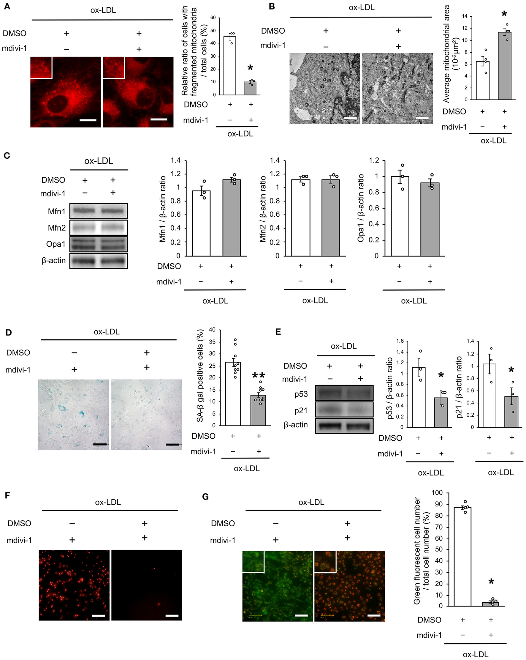 Mdivi-1 treatment retarded excessive mitochondrial fission, ROS production, mitochondrial dysfunction and cellular senescence, which were induced by ox-LDL. (A) Representative images and quantitative analysis of Mito-tracker Red in ox-LDL-treated cells with mdivi-1 or the control vehicle. Scale bar = 10 μm. *P < 0.05 vs. ox-LDL with the control (n = 3 per group). (B) Electron microscopic images and quantitative analysis of mitochondria and average mitochondrial areas in ox-LDL-treated cells with mdivi-1 or the control. Scale bar = 1 μm. *P < 0.05 vs. ox-LDL with the control (n = 4 per group). (C) Immunoblots and quantitative analysis for Mfn1, Mfn2, Opa1, and β-actin in ox-LDL-treated cells with mdivi-1 or the control (n = 3 per group). (D) Representative images and quantitative analysis of SA-β gal staining of ox-LDL-treated cells with mdivi-1 or the control. **P < 0.01 vs. ox-LDL with the control (n = 9 per group). (E) Immunoblots and quantitative analysis for p53, p21, and β-actin in ox-LDL-treated cells with mdivi-1 or the control. *P < 0.05 vs. ox-LDL with the control (n = 3 per group). (F) Representative images of MitoSox Red in ox-LDL-treated cells with mdivi-1 or the control. Scale bar = 100 μm. (G) Representative images and quantitative analysis of JC-1 staining in ox-LDL-treated cells with mdivi-1 or the control. Scale bar = 100 μm. *P < 0.05 vs. ox-LDL with the control (n = 3 per group). All data are presented as the mean ± SEM. Statistical analysis were conducted by Wilcoxon rank sum test (A-C,E,G) and Student's t-test (D).