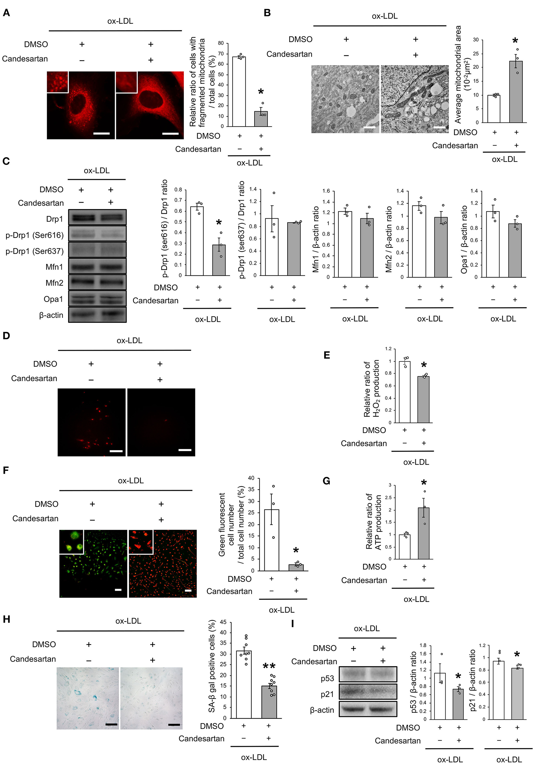 AT1R inhibition retarded excessive mitochondrial fission, ROS production, mitochondrial dysfunction, and cellular senescence, which are induced by ox-LDL. (A) Representative images and quantitative analysis of Mitotracker Red in ox-LDL-treated cells with Candesartan or the control vehicle. Scale bar = 10 μm. *P < 0.05 vs. ox-LDL with the control (n = 3 per group). (B) Electron microscopic images and quantitative analysis of mitochondria and average mitochondrial areas in Candesartan-treated vs. vehicle-treated cells with ox-LDL. *P < 0.05 vs. ox-LDL with the control (n = 3 per group). (C) Immunoblots and quantitative analysis for Drp1, p-Drp1 (Ser616), p-Drp1 (Ser637), Mfn1, Mfn2, Opa1, and β-actin in ox-LDL treated cells with Candesartan or the control. *P < 0.05 vs. ox-LDL with the control (n = 3 per group). (D) Representative images of MitoSox Red in ox-LDL-treated cells with Candesartan or the control vehicle. (E) Relative mitochondrial H2O2 production in ox-LDL-treated cells with Candesartan or the control. *P < 0.05 vs. ox-LDL with control vehicle (n = 3 per group). (F) Representative images and quantitative analysis of JC-1 staining in ox-LDL-treated cells with Candesartan or the control. Scale bar = 100 μm. *P < 0.05 vs. ox-LDL with the control (n = 3 per group). (G) Relative mitochondrial ATP production in ox-LDL-treated cells with Candesartan or the control. *P < 0.05 vs. ox-LDL with the control. (n = 3 per group). (H) Representative images and quantitative analysis of SA-β gal staining of ox-LDL-treated cells with Candesartan or the control. Scale bar = 100 μm. **P < 0.01 vs. ox-LDL with the control (n = 8 per group). (I) Immunoblots and quantitative analysis for p53, p21, and β-actin in cells with Candesartan or the control under ox-LDL treatment. *P < 0.05 vs. ox-LDL with the control (n = 3 per group). All data are presented as the mean ± SEM. Statistical analysis were conducted by Wilcoxon rank sum test (A-C,E-G,I) and Student's t-test (H).