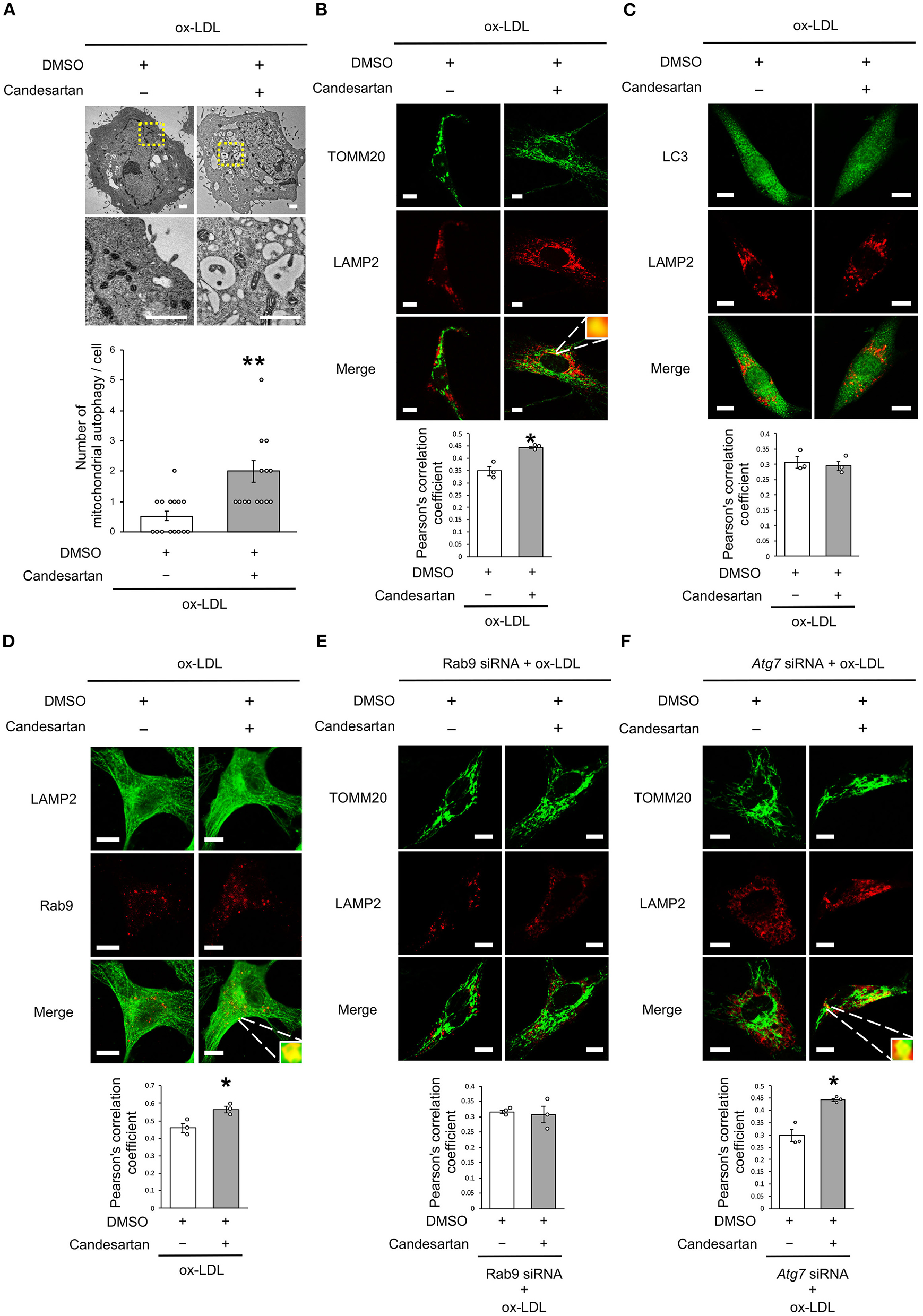 AT1R inhibition induced mitochondrial autophagy derived from Rab9-dependent alternative autophagy with ox-LDL treatment. (A) Electron microscopic images and quantitative analysis of the number of mitochondrial autophagy in Candesartan-treated vs. the control cells with ox-LDL. Scale bar = 1 μm. **P < 0.01 vs. ox-LDL with the control (n = 15 per group). (B) Representative images and quantitative analysis of TOMM20 (green) and LAMP2 (red) immunohistochemistry in Candesartan-treated vs. control cells with ox-LDL. Scale bar = 10 μm. *P < 0.05 vs. ox-LDL with the control (n = 3 per group). (C) Representative images and quantitative analysis of LC3 (green) and LAMP2 (red) immunohistochemistry in Candesartan-treated vs. control vehicle-treated cells with ox-LDL (n = 3 per group). Scale bar = 10 μm. (D) Representative images and quantitative analysis of LAMP2 (green) and Rab9 (red) immunohistochemistry in Candesartan-treated vs. control cells with ox-LDL. Scale bar = 10 μm. *P < 0.05 vs. ox-LDL with the control (n = 3 per group). (E) Representative images and quantitative analysis of TOMM20 (green) and LAMP2 (red) immunohistochemistry in Candesartan-treated vs. control cells transfected with siRab9 under ox-LDL treatment. Scale bar = 10 μm. (n = 3 per group). (F) Representative images and quantitative analysis of TOMM20 (green) and LAMP2 (red) immunohistochemistry in Candesartan-treated vs. control cells transfected with siAtg7 under ox-LDL treatment. Scale bar = 10 μm. *P < 0.05 when compared with control vehicle-treated cells transfected with siAtg7 under ox-LDL treatment (n = 3 per group). All data are presented as the mean ± SEM. Statistical analysis were conducted by Wilcoxon rank sum test (B,C,E,F) and Student's t-test (A).