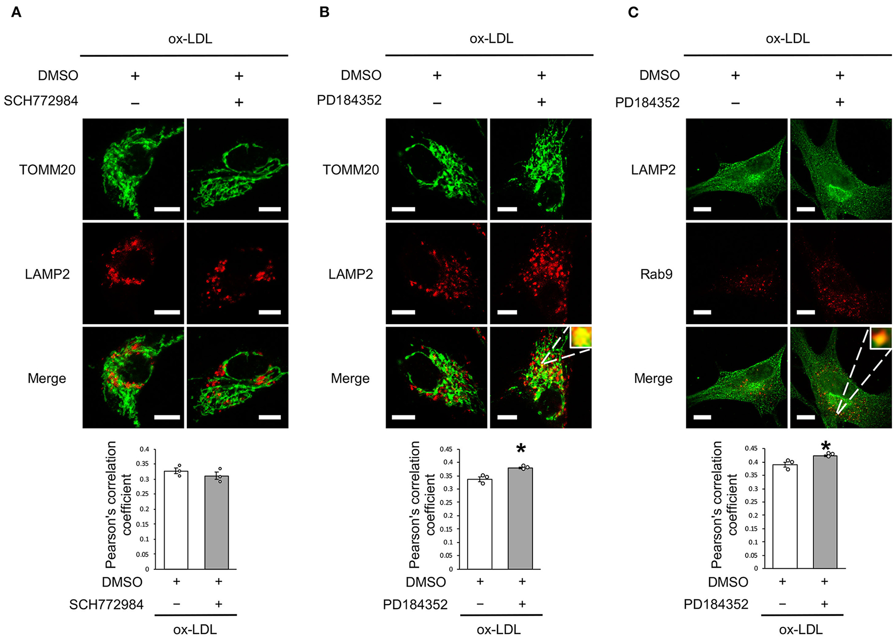 Rab9-dependent mitochondrial autophagy was not affected by ERK inhibition but was affected by MEK inhibition. (A) Representative images and quantitative analysis of TOMM20 (green) and LAMP2 (red) immunohistochemistry in SCH772984-treated vs. control vehicle-treated cells with ox-LDL. Scale bar = 10 μm. (n = 3 per group). (B) Representative images and quantitative analysis of TOMM20 (green) and LAMP2 (red) immunohistochemistry in PD184352-treated vs. control vehicle-treated cells with ox-LDL. Scale bar = 10 μm. *P < 0.05 when compared with ox-LDL with the control (n = 3 per group). (C) Representative images and quantitative analysis of LAMP2 (green) and Rab9 (red) immunohistochemistry in PD184352-treated vs. control cells with ox-LDL. Scale bar = 10 μm. *P < 0.05 when compared with ox-LDL with the control (n = 3 per group). All data are presented as the mean ± SEM. Statistical analysis were conducted by Wilcoxon rank sum test (A-C).