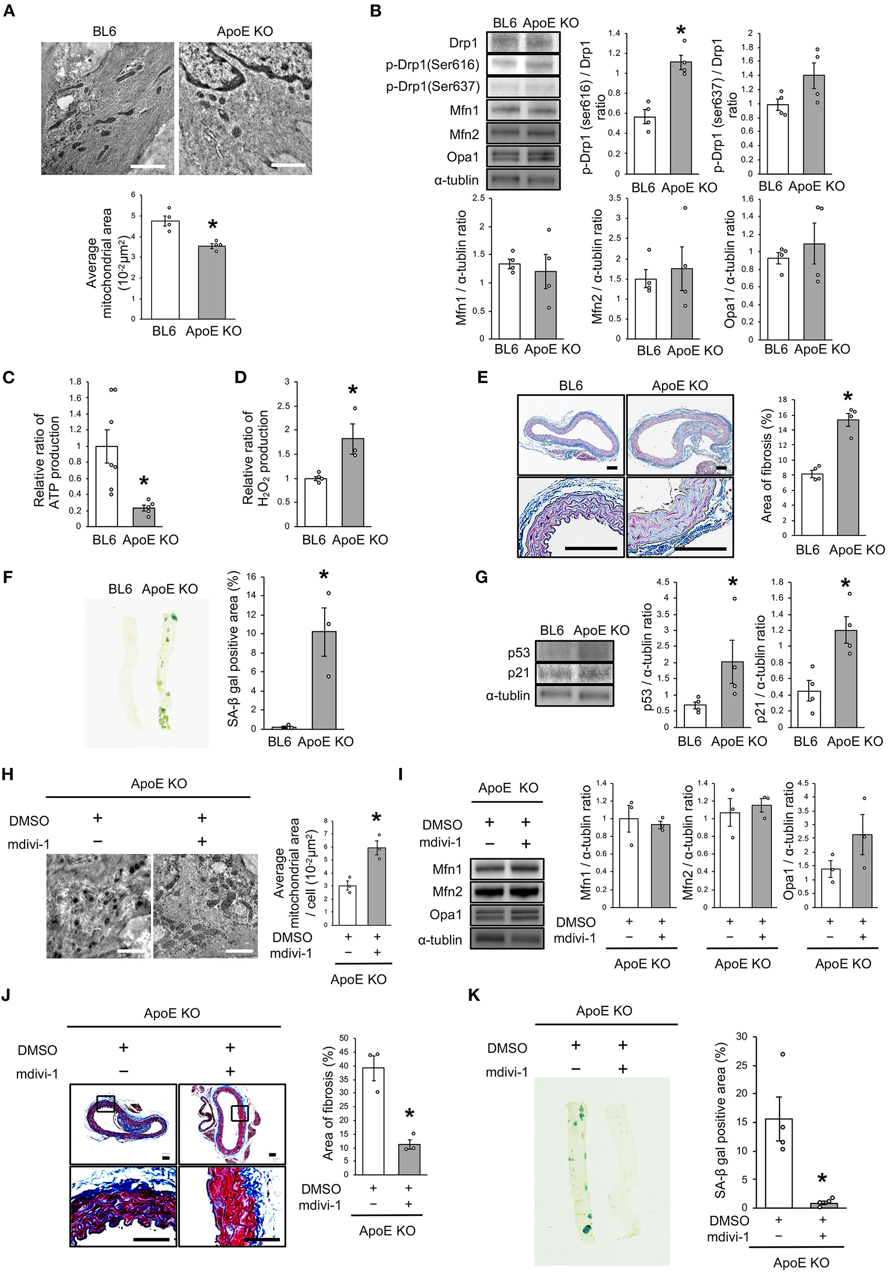 Drp1 inhibition improved the imbalance of excessive mitochondrial fission and vascular senescence in ApoE KO mice. (A) Electron microscopic images and quantitative analysis of mitochondria and average mitochondrial areas in C57BL/6 and ApoE KO mice. Scale bar = 1 μm. *P < 0.05 vs. C57BL/6 (n = 4 per group). (B) Immunoblots and quantitative analysis for Drp1, p-Drp1 (Ser616), p-Drp1 (Ser637), Mfn1, Mfn2, Opa1, and α-tublin in C57BL/6 and ApoE KO mice. *P < 0.05 vs. C57BL/6 (n = 4 per group). (C) Relative mitochondrial ATP production in C57BL/6 and ApoE KO mice. *P < 0.05 vs. C57BL/6 (C57BL/6; n = 7, ApoE KO mice; n = 5). (D) Relative mitochondrial H2O2 production in C57BL/6 and ApoE KO mice. *P < 0.05 vs. C57BL/6 (n = 4 per group). (E) Representative images and quantitative analysis of Masson's trichrome staining in C57BL/6 and ApoE KO mice. Scale bar = 100 μm. *P < 0.05 vs. C57BL/6 (n = 4 per group). (F) Representative images and quantitative analysis of SA-β gal staining of arteries in C57BL/6 and ApoE KO mice. *P < 0.05 vs. C57BL/6 (n = 3 per group). (G) Immunoblots and quantitative analysis for p53, p21, and α-tublin in C57BL/6 and ApoE KO mice. *P < 0.05 vs. C57BL/6 (n = 4 per group). (H) Electron microscopic images and quantitative analysis of mitochondria and average mitochondrial areas in ApoE KO mice treated with mdivi-1 or the control. Scale bar = 1 μm. *P < 0.05 vs. ApoE KO mice with the control (n = 3 per group). (I) Immunoblots and quantitative analysis for Mfn1, Mfn2, Opa1, and α-tublin in ApoE KO mice treated with mdivi-1 or the control, (n = 3 per group). (J) Representative images and quantitative analysis of Masson's trichrome staining in ApoE KO mice treated with mdivi-1 or the control. Scale bar = 100 μm. *P < 0.05 vs. ApoE KO mice with the control (n = 3 per group). (K) Representative images and quantitative analysis of SA-β gal staining of the arteries in ApoE KO mice treated with mdivi-1 or the control. *P < 0.05 vs. ApoE KO mice with the control (n = 3 per group). All data are presented as the mean ± SEM. Statistical analysis were conducted by Wilcoxon rank sum test (A,B,D-K) and Student's t-test (C).